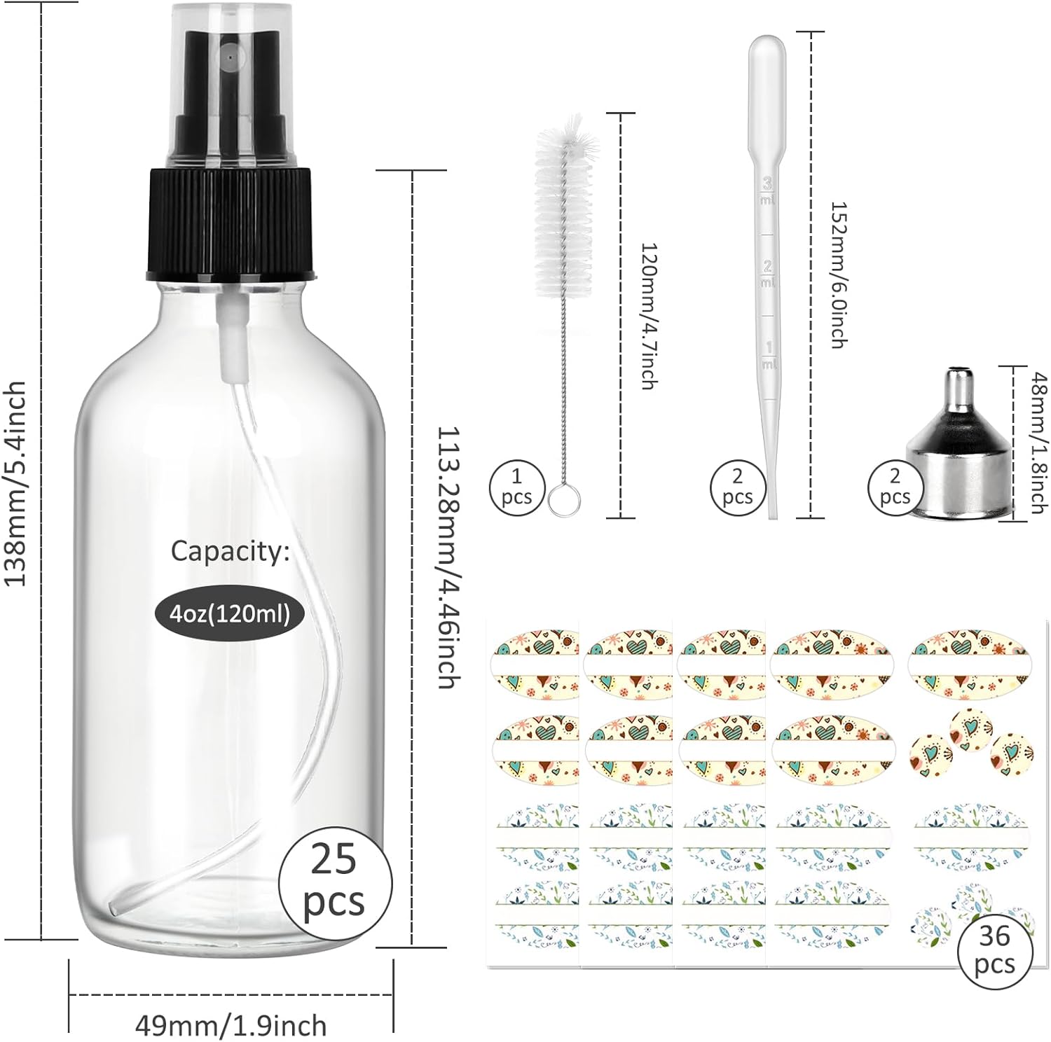 CycleMore 25 Pack 4oz Clear Glass Spray Bottles with Fine Mist Sprayers, Glass Travel Bottles for Cosmetic Essential Oils Cleaning Solutions Perfumes & More Liquids (1 Brush, 2 Funnels and 36 Labels)