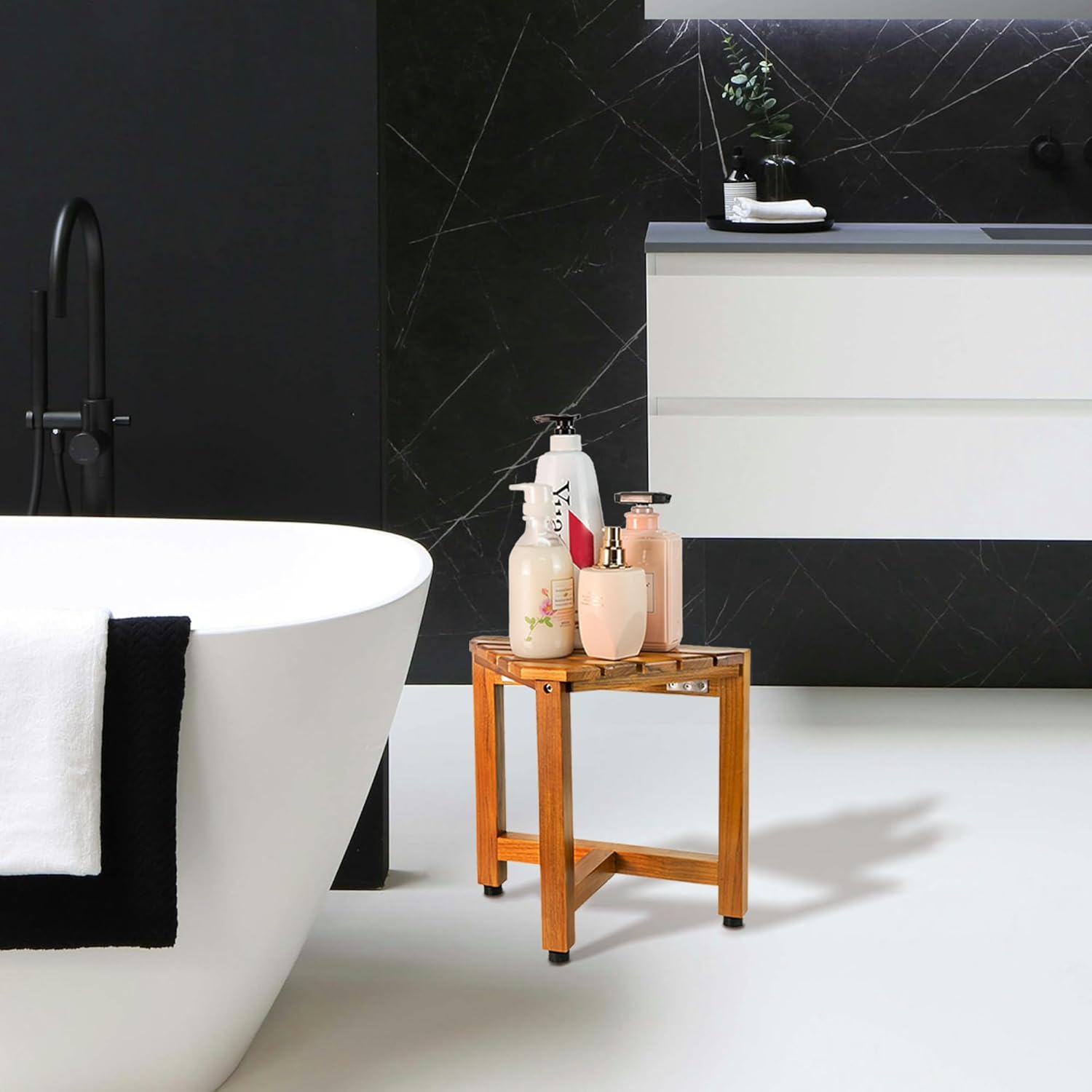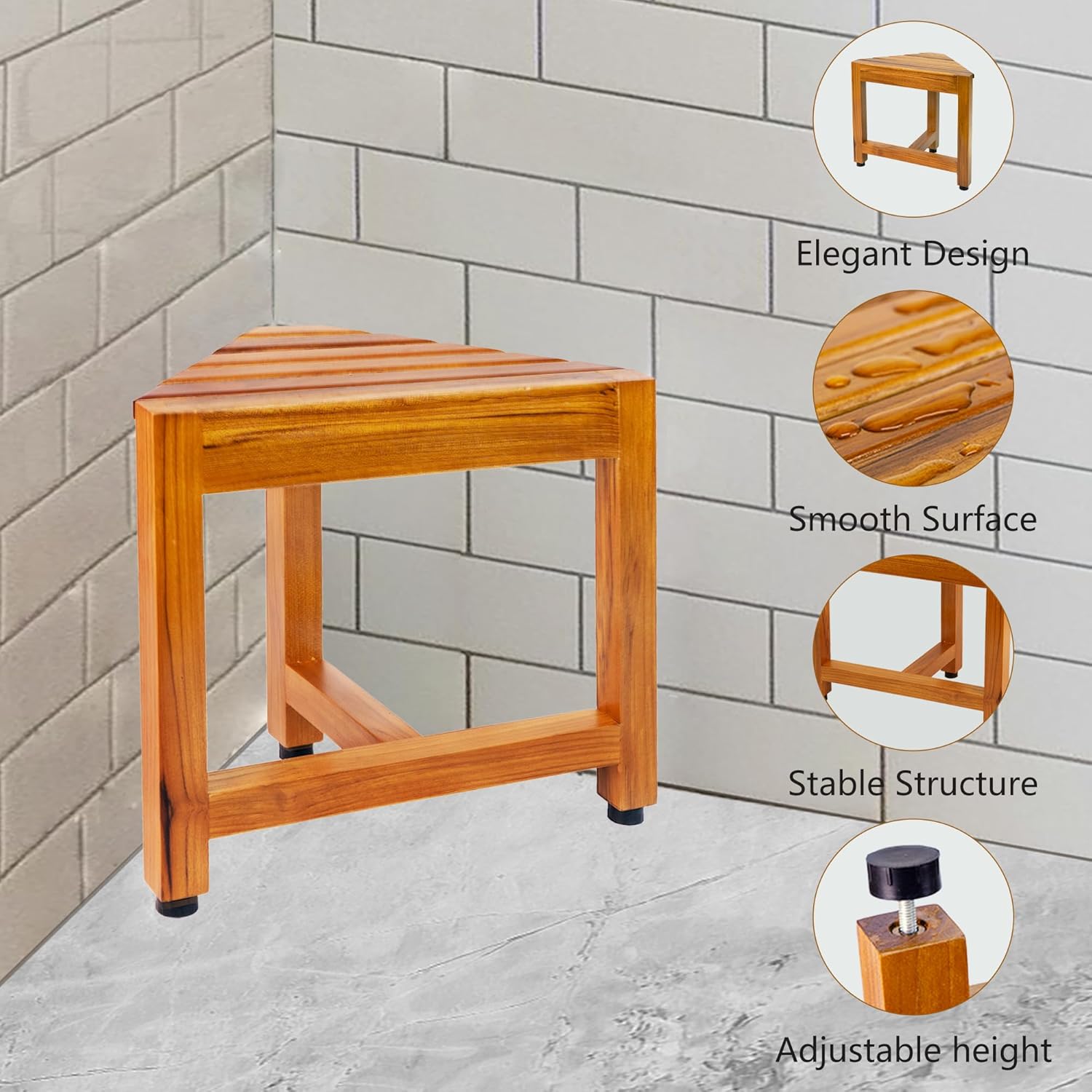 VaeFae Teak Shower Corner Bench, Wooden Foot Rest, Shower Bench for Shaving, Corner Shower Stool for Inside Shower, Bathroom