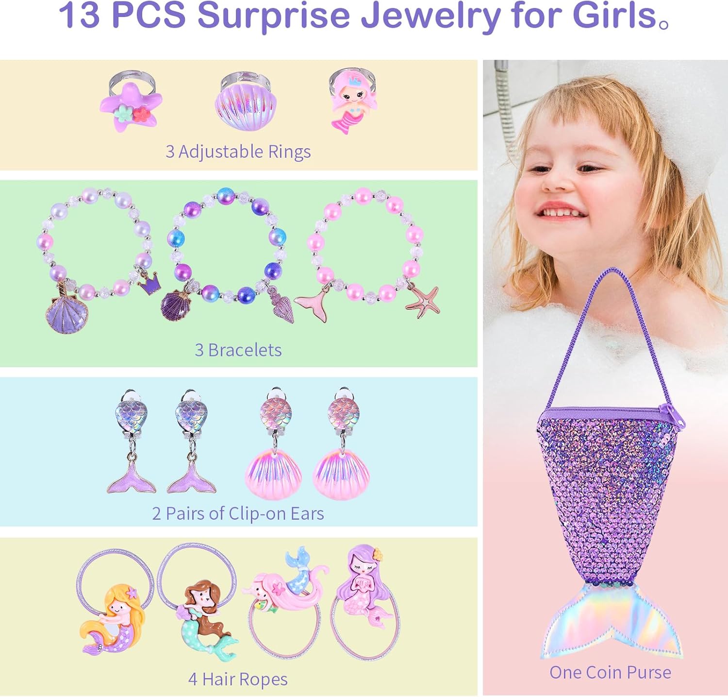 - 【Bath Bombs with Surprise Jewelry Inside】Each bath bombs for kids contains a mermaid themed jewelry inside. The jewelry includes 3 adjustable rings, 2 pairs of clip-on ears, 3 bracelets, 4 hair ropes, and each gift set comes with a coin purse, totally 13 pcs jewelries. Our jewelry are made of safe material and do not cause choking hazard. Girls will get a full set of jewelry gift, and the mermaids are favorites of the girls, it’s a magic token that turns a girl into a mermaid princess.