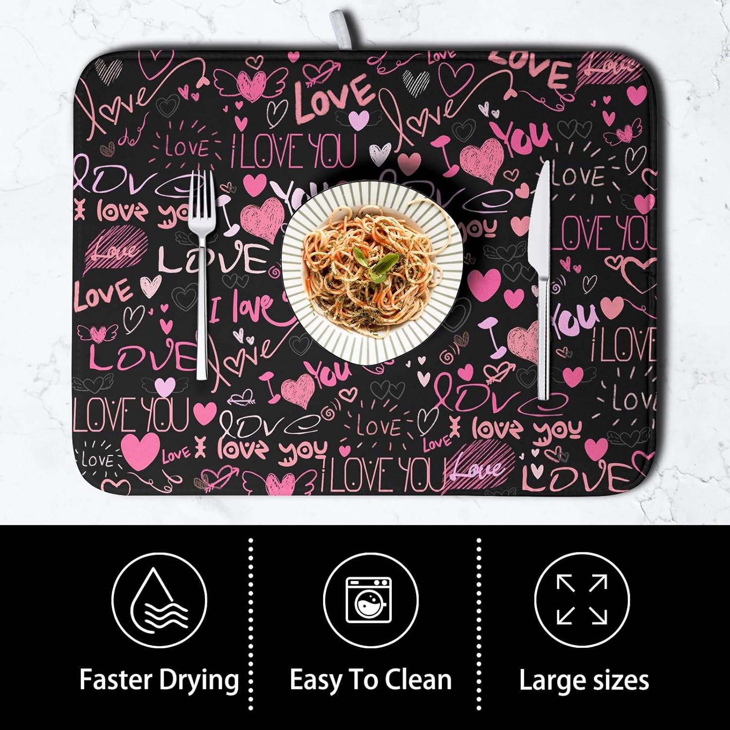 - 【Ultra Absorbency】The surface of the Valentine's Day dish drying mat is made of absorbent microfiber and the middle is made of composite sponge, absorbs 4X its weight in water, keep your counter dry. Absorbent, Colorful, Reversible, do not fade.