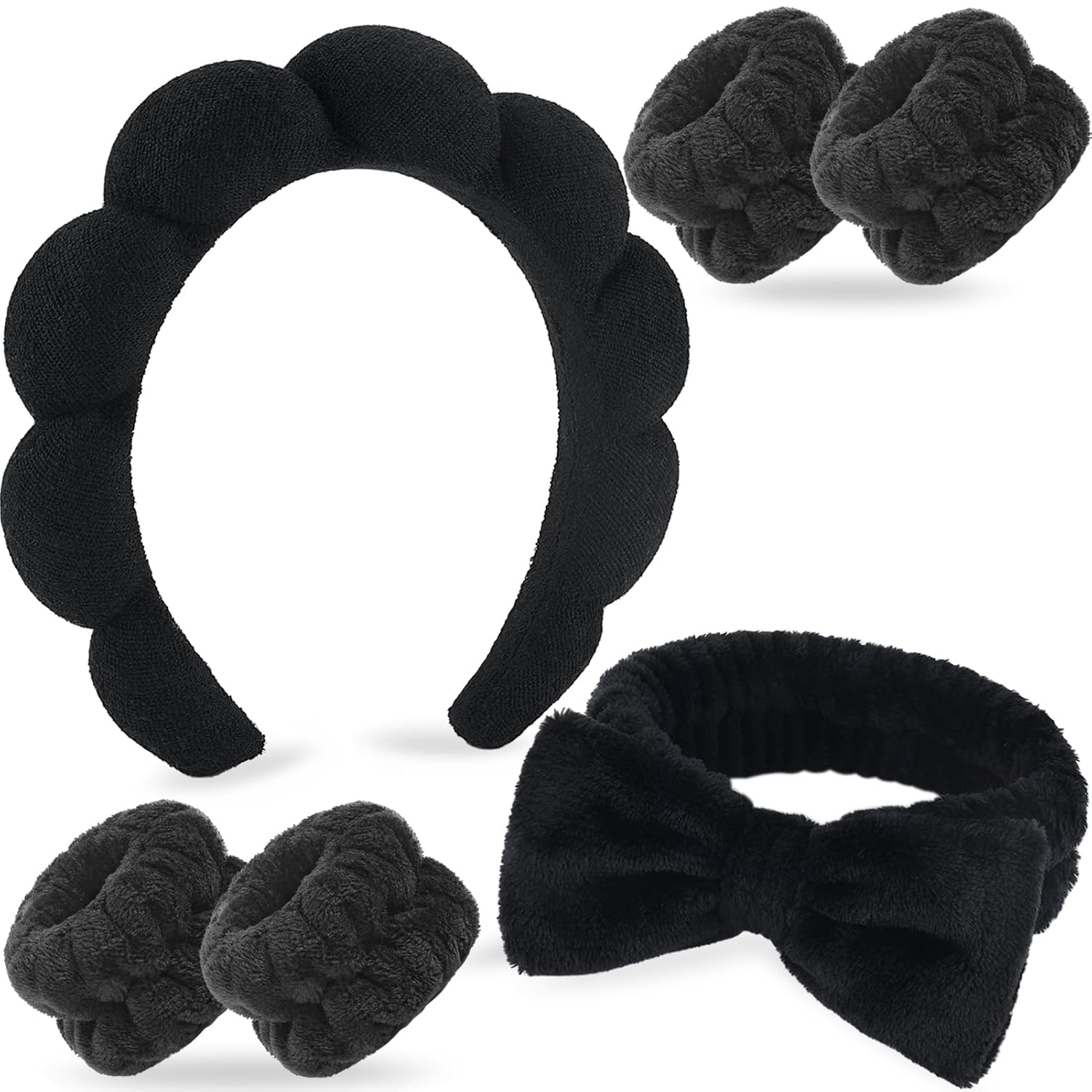 Zkptops 6Pcs Spa Headband for Washing Face Wristbands Set Women Bubble Skincare Makeup Sponge Terry Cloth Padded Puffy Headband Bow Tie Hairband Cute Non Slip Thick Hair Accessory Gifts(Black)