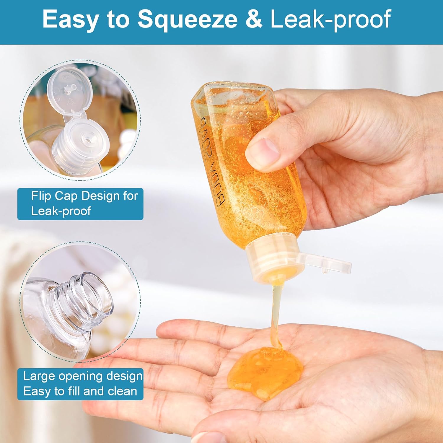 - High-Quality and Leak-proof Squeeze Bottle: Made of sturdy, reusable PET plastic, these travel size toiletries bottles are lightweight and space-saving; The flip caps of these travel bottles are designed with a tight seal to prevent leakage or spills and ensure that your personal care products stay secure and no mess, perfect travel shampoo bottles, empty travel size bottles.