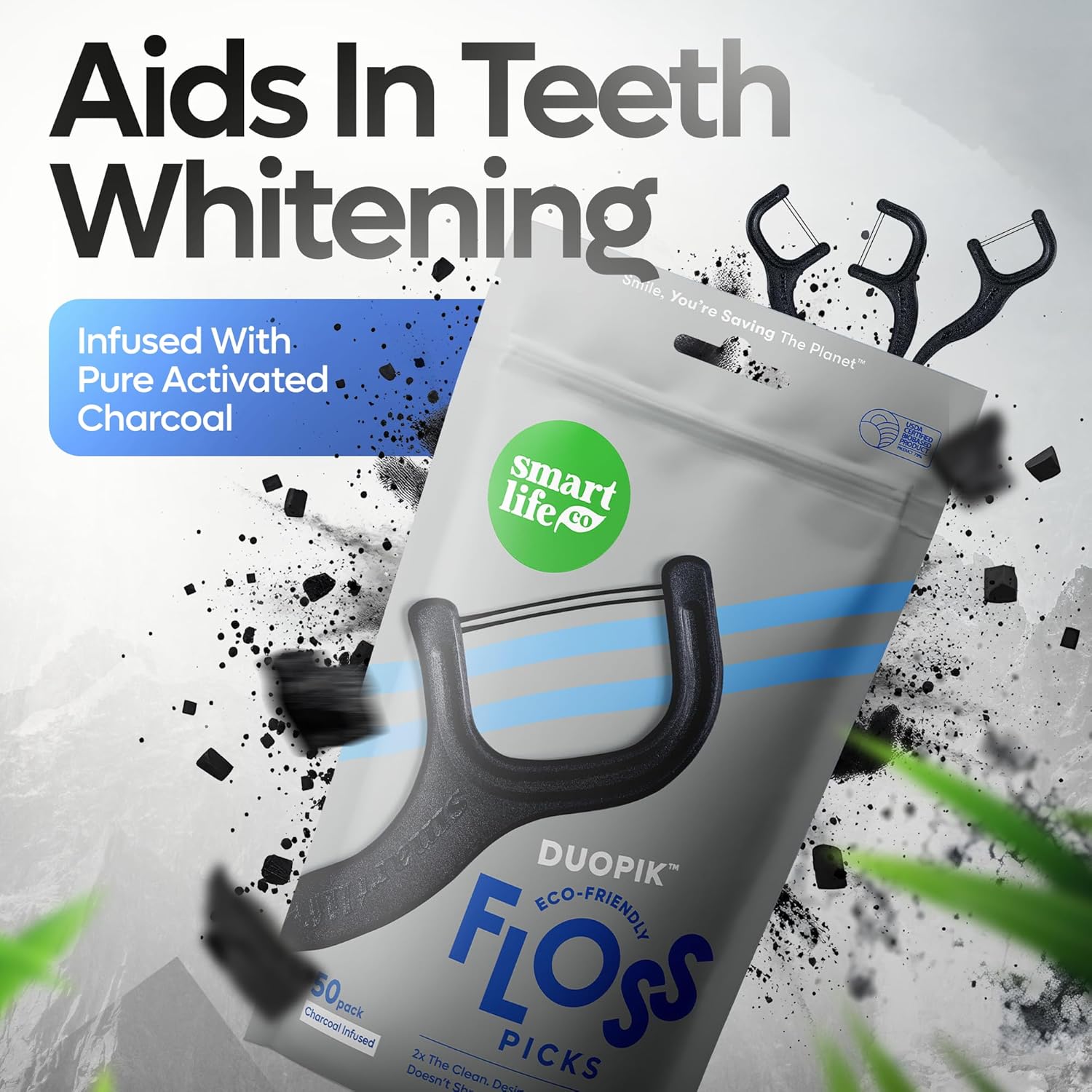 SmartLifeco Eco-Friendly Dual-Thread Dental Floss Picks (200ct) - Flossers Made with Straw Wheat Blend, Natural Teeth Whitening, Tooth Pick Stick for Adults, Activated Bamboo Charcoal Floss Thread
