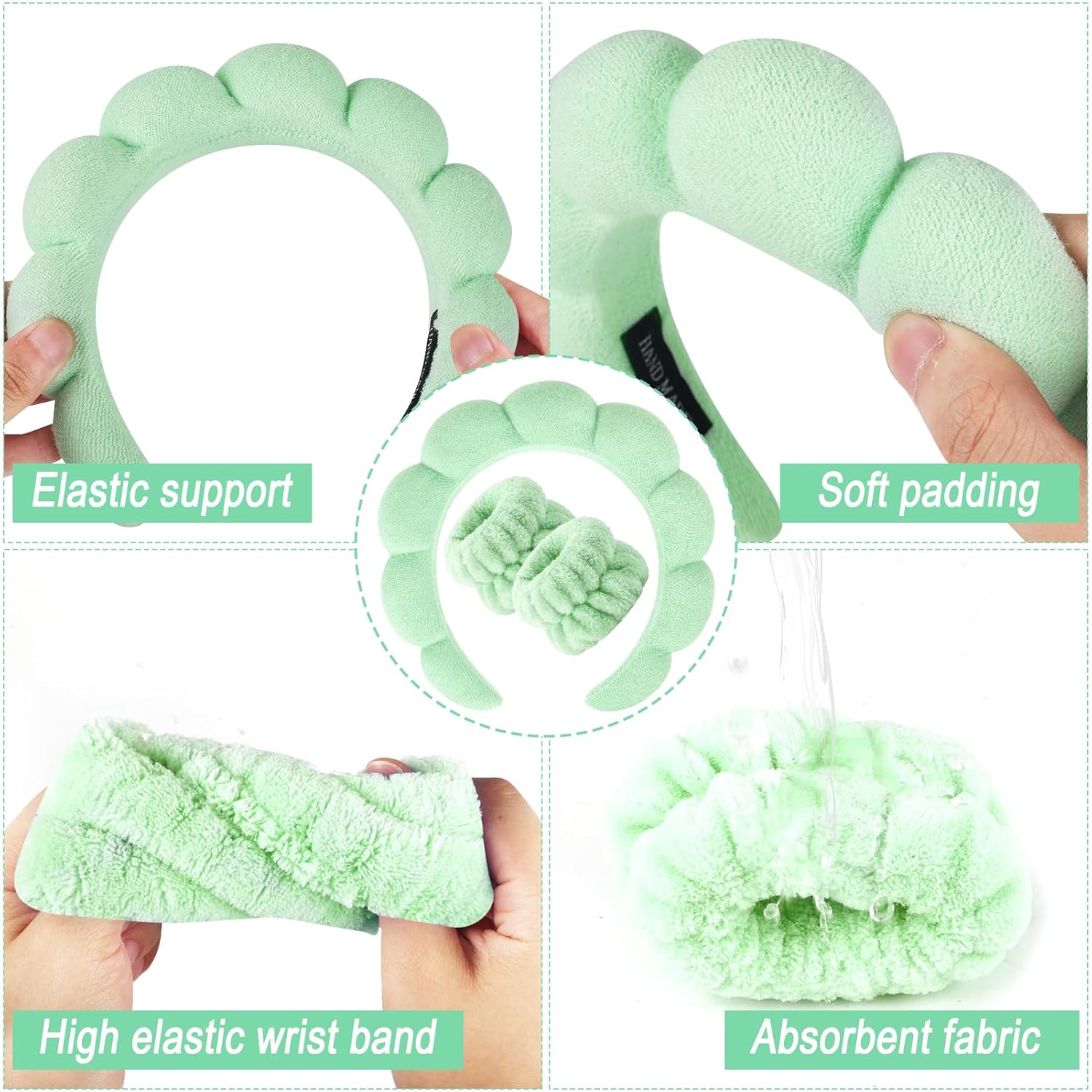 - SPA HEADBAND and WRISTBAND MATERIAL: Patent No.: US D1018980 S. Spa headband and wristband set is the perfect pink gift solution. Bubble Spa headband for women the sponge lining used and the terry cloth covering the surface. These skincare headbands have a strong water absorption function and can be used when you are washing your face, skincare or makeup. The wristbands are made of quality coral fleece. And wristbands also have good elasticity, can be stretched to fit your wrist better