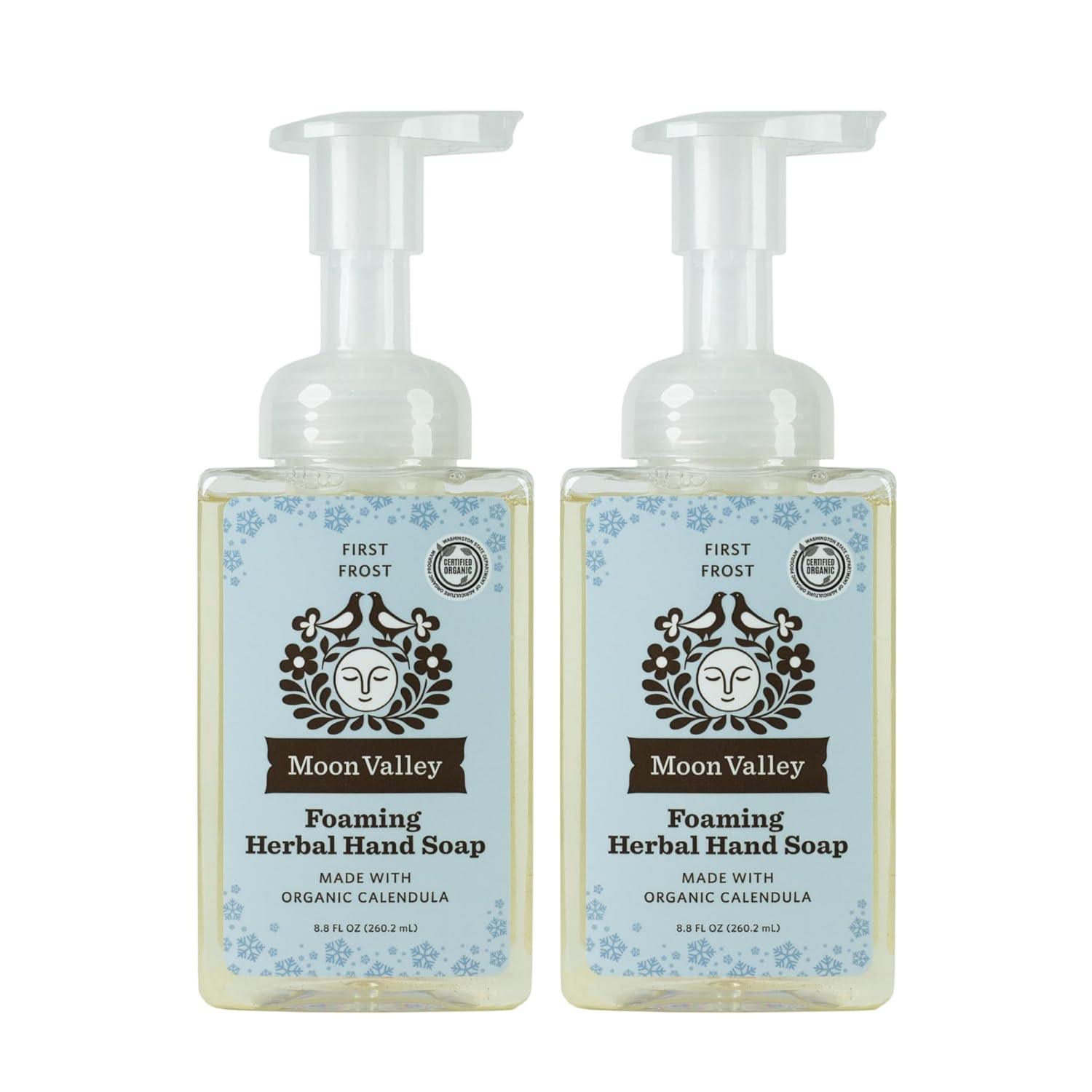 - TWO-PACK: This bundle of two 8.8oz Foaming Hand Soaps includes fresh and natural scents of First Winter Frost. Moon Valley Organics Herbal Foaming Hand Soaps are certified organic, vegan and non-gmo. Each bottle is recyclable. Ingredients leave hands soft and moisturized.