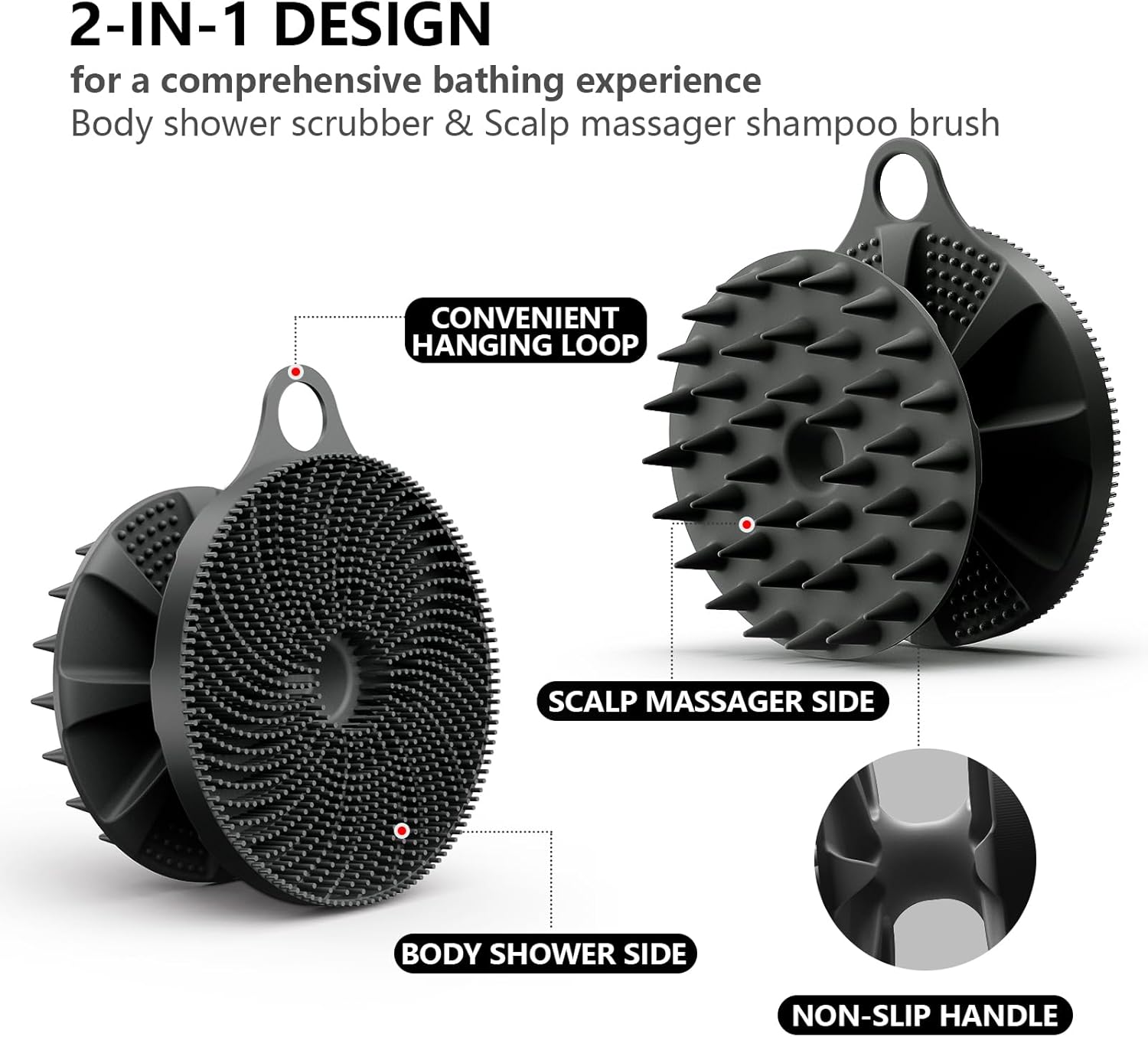 2 in 1 Silicone Brush, BEAUTAIL Body Shower Scrubber and Scalp Hair Massager Shampoo Brush, Deeply Cleanse Skin, Dandruff Removal and Hair Growth, Gentle for Women Men Sensitive Skin, 1 Pack (Black)