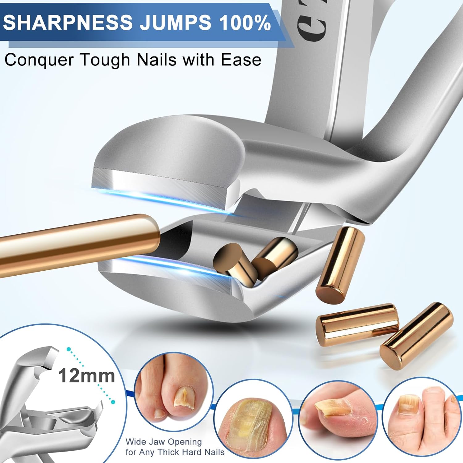 - 【Ultra-Sharp & Curved Blades】The Sharp nail clippers set is made of high quality stainless steel, and the curved blades allow you to cut natural curves with precision, is perfect for your thick toe nails due to tough, aging and other health concerns, the lever technology used in mess free nail clippers to cut thickest and hardest nails in minimum force.
