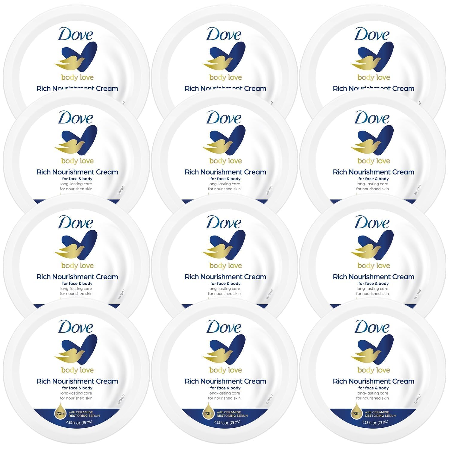Dove Body Love Rich Nourishment Cream, Face, Hand & Body Lotion for Extremely Dry Skin, Fast-Absorbing 72-Hour Moisturizing Cream with Ceramide Serum, Travel Size, 2.53 Oz (Pack of 12)