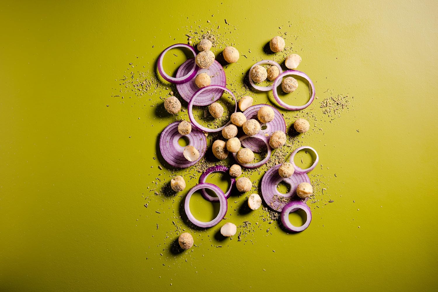 - ONION MACADAMIAS: Dry-roasted macadamia nuts with onion, sea salt, garlic and parsley - that’s it. Simple ingredients to complement these naturally buttery nuts.