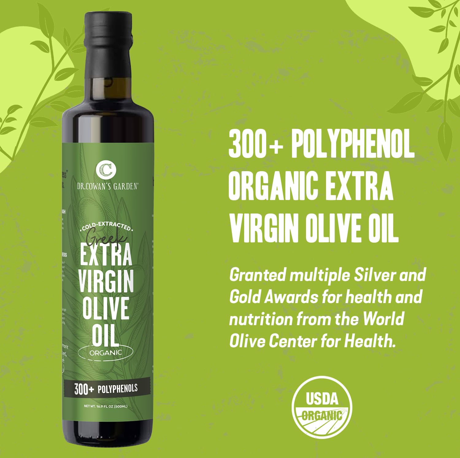 Dr. Cowan’s Garden 300+ Polyphenol Greek Extra Virgin Olive Oil - Single Estate Extra Virgin Olive Oil with Highest Polyphenols Sourced from Koroneiki Trees, Phase 2 Organic, Cold-Pressed, 16.9 FL Oz