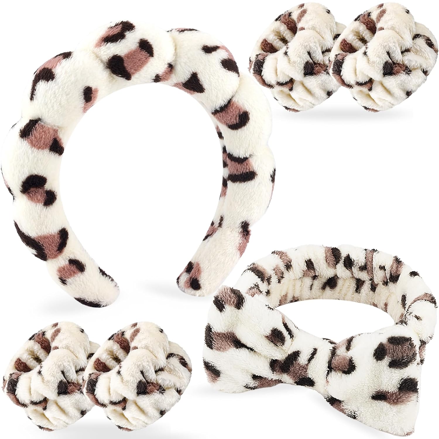 Zkptops 6Pcs Spa Headband for Washing Face Wristbands Set Women Bubble Skincare Makeup Sponge Plush Padded Puffy Headband Bow Tie Hairband Cute Non Slip Thick Hair Accessory Gifts(Beige Leopard)