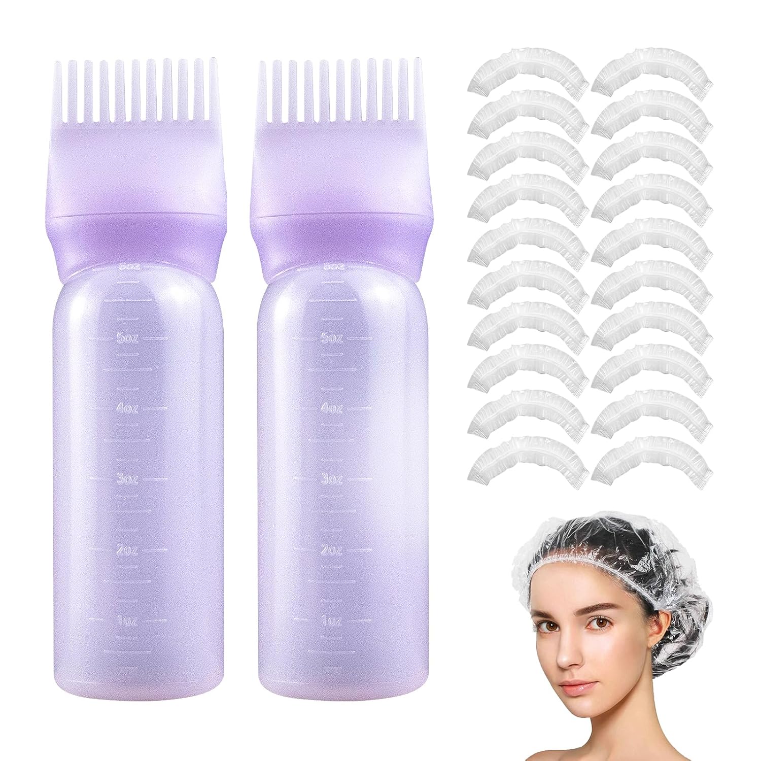 Root Comb Applicator Bottle, 6 Ounce, Hair Oil Applicator, Oil Applicator for Hair Dye, Oil Bottles for Hair, Hair Oiling Applicator with Graduated Scale (2 Pack+20 PCS Disposable Shower Caps, Purple)