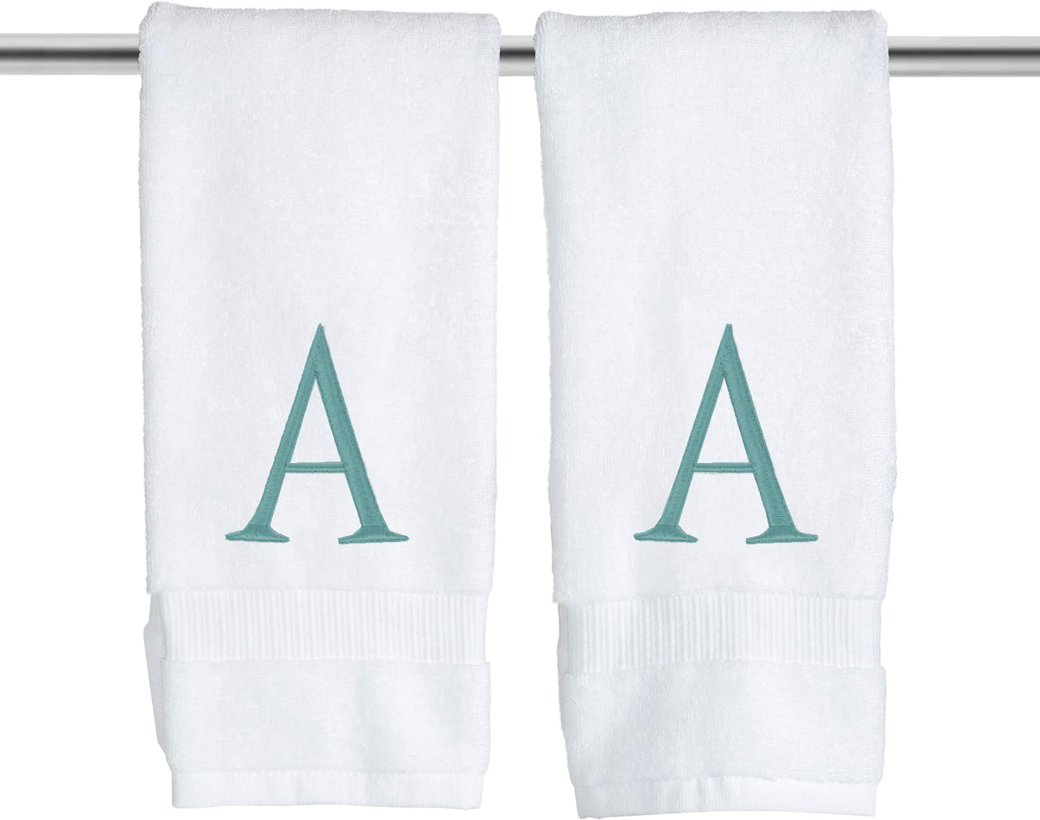 Teal Monogrammed Hand Towels for Bathroom - Teal and White Luxury Hotel Quality Personalized Initial Decorative Embroidered Towel for Powder Room, Spa - GOTS Organic Certified - Set of 2 Letter A