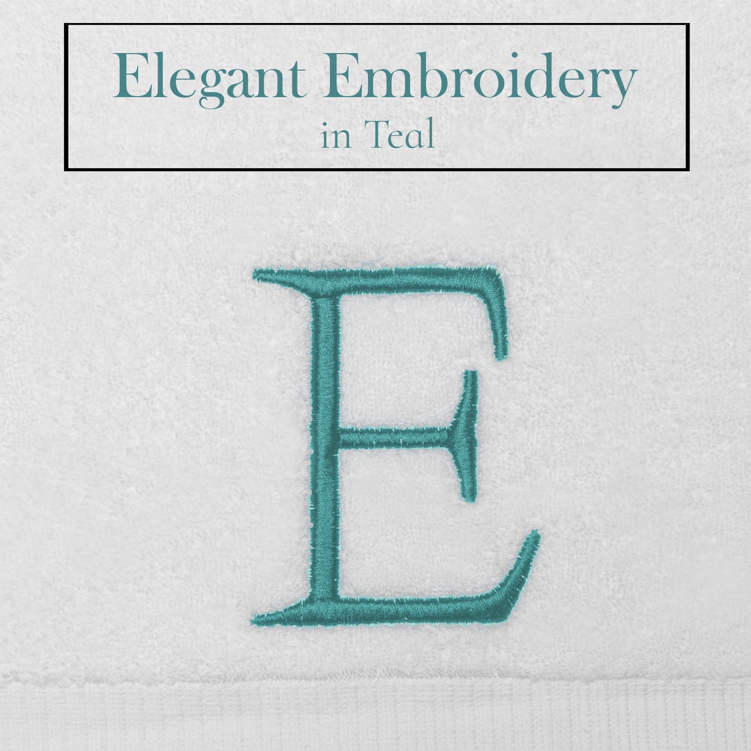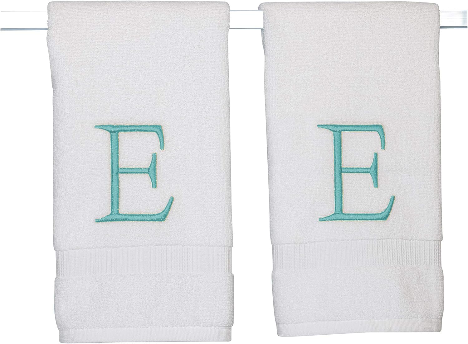 White Monogram Hand Towel for Bathroom - Monogrammed Initial Hotel Quality Decorative Embroidered Luxury Towel for Powder Room, Spa - GOTS Organic Certified - Set of 2 Teal Letter E