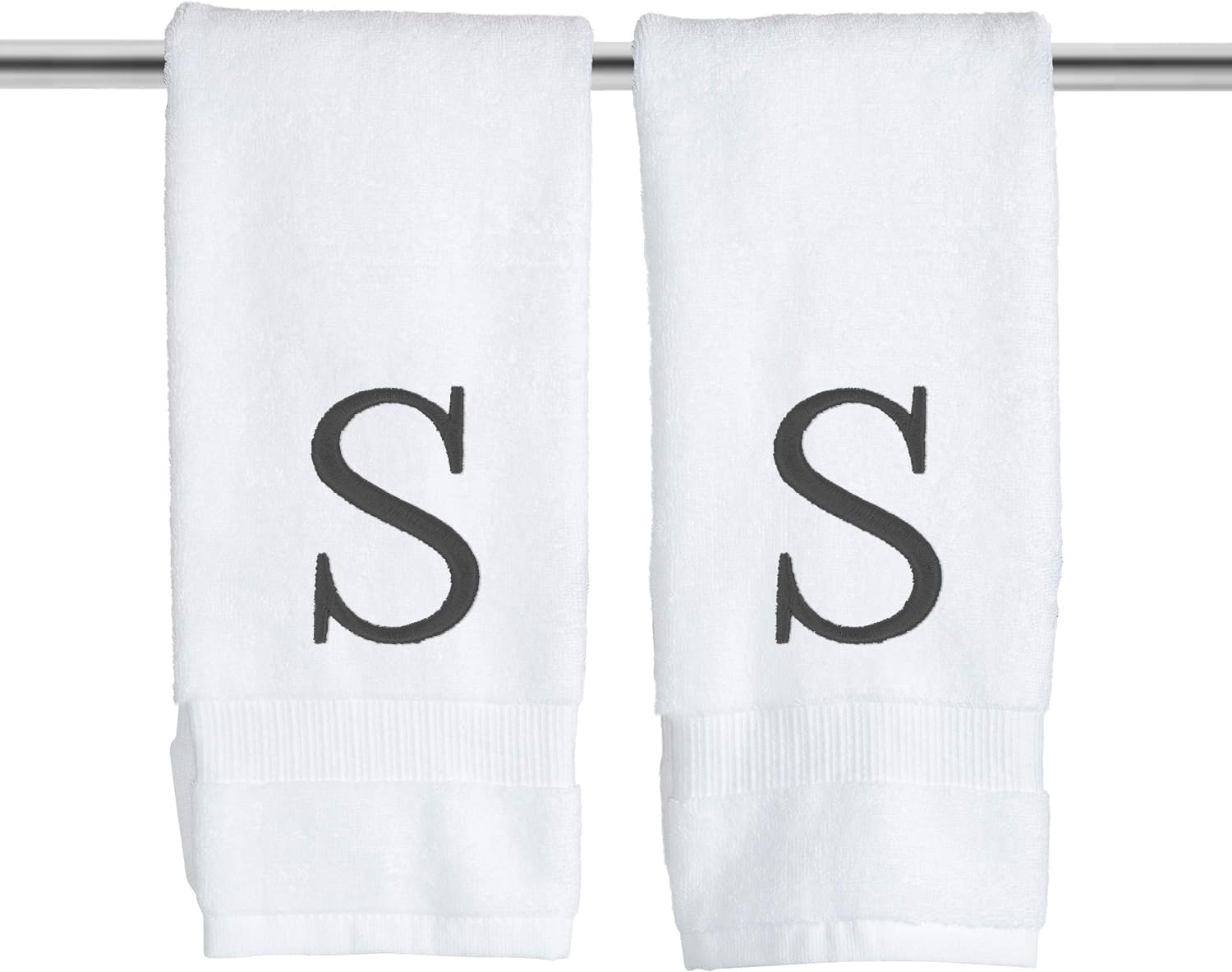 Dark Gray, Letter Hand Towel for Bathroom - Monogrammed Initial Hotel Quality Decorative Embroidered Towel for Powder Room, Spa - GOTS Organic Certified - Pack of 2, Letter S