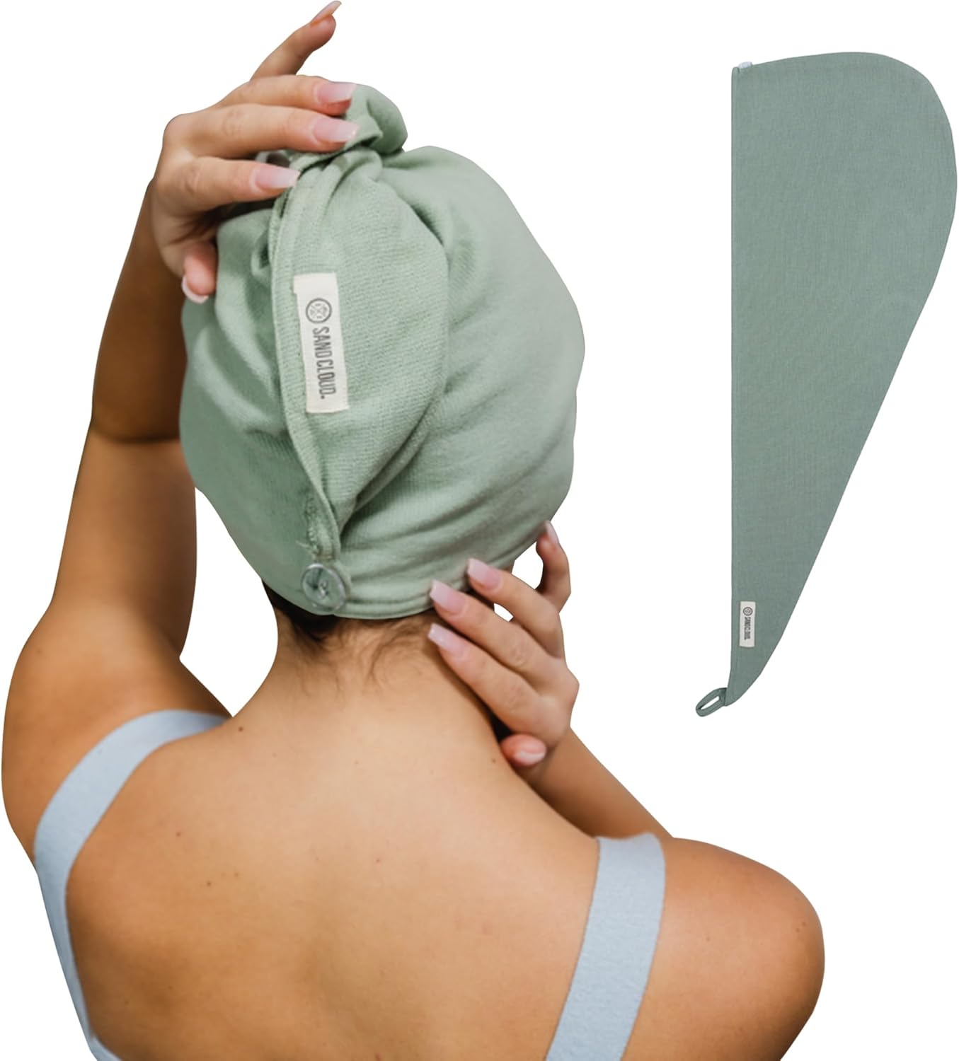 Sand Cloud Cotton Hair Towel Wrap, Sage - Quick Dry Hair Towel for Wet Hair - 100% Turkish Organic Cotton, Half Terry Weave with Binding Edge - 10" x 15" Lightweight, Frizz-Free Hair Drying Towel
