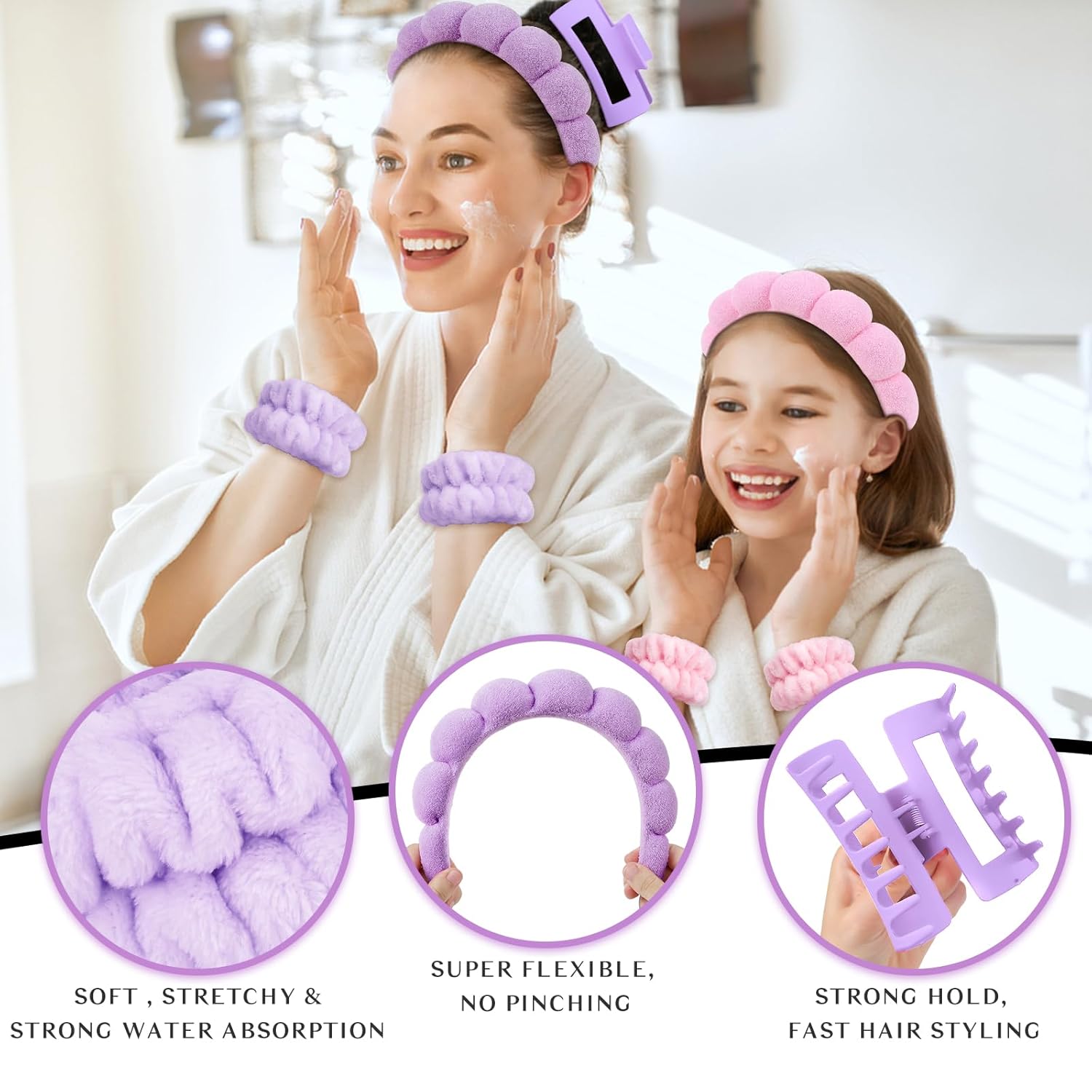- Comfortable & practical: made from soft microfiber material, these wrist towels and bubble headband for washing face are soft, gentle on the skin, and highly absorbent, making them perfect for all your skincare needs. the hair claw clip can firmly hold your hair, very light and easy to use.