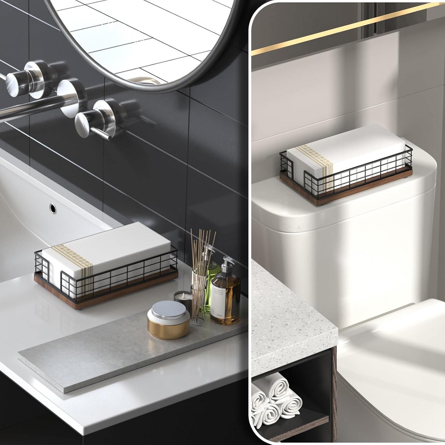 Wican Guest Towel Holder Tray for Bathroom, Oak and Iron Napkins Holder for Powder Room Dinning Table Wooden Basket for Disposable Paper Hand Towels Black & Walnut
