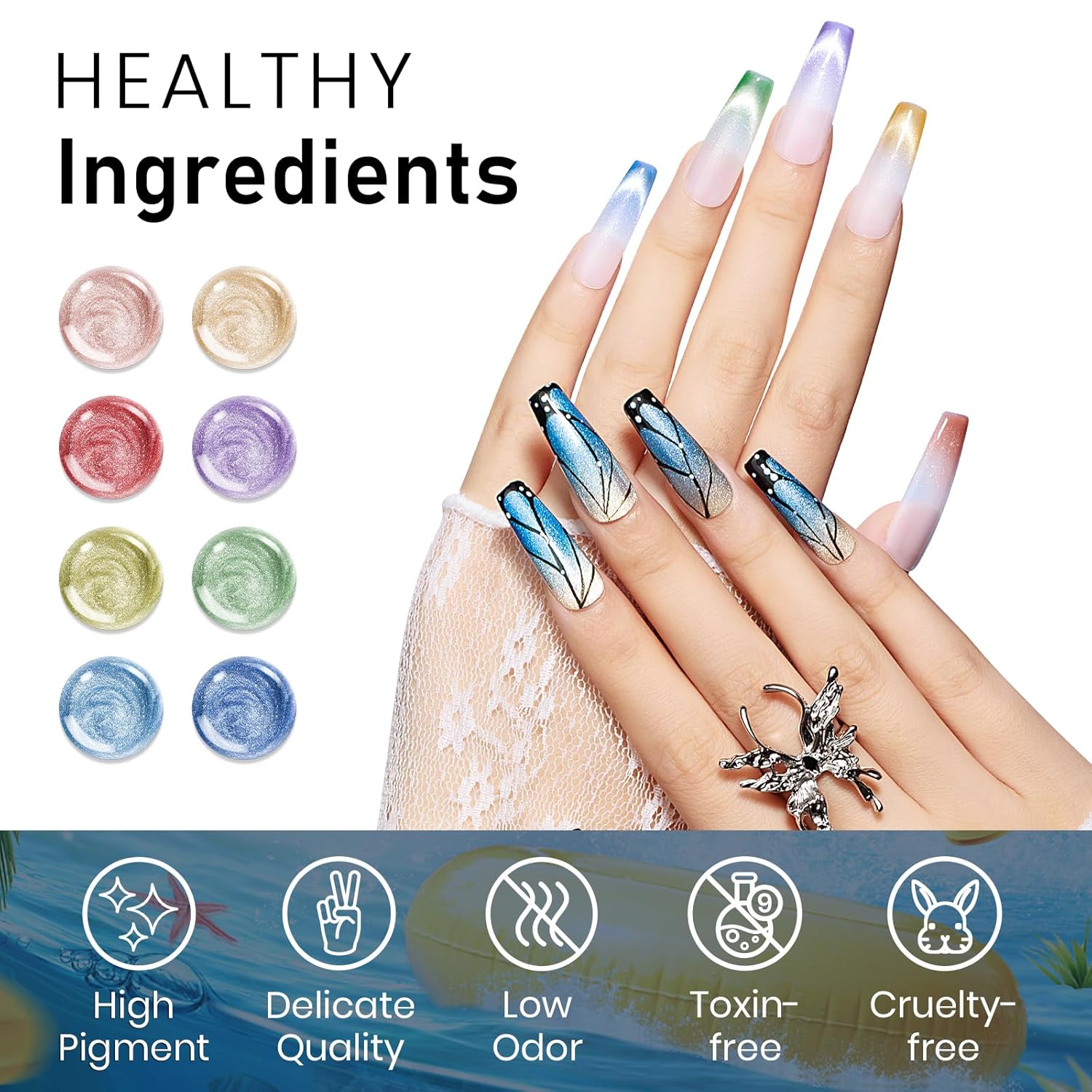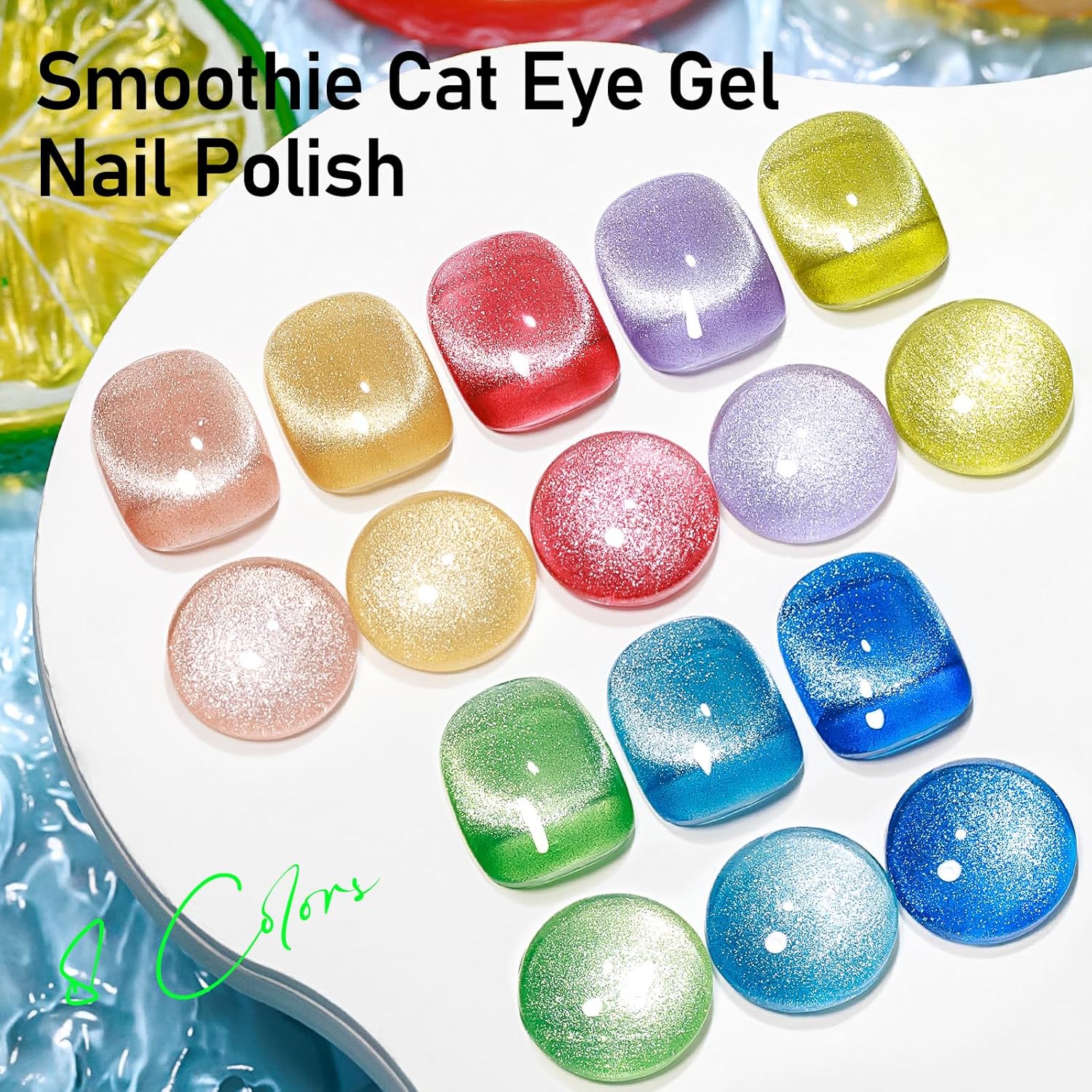 - MIZHSE Summer Cat Eye Gel Nail Polish: 8 colors frosty magnetic gel polish collection, 1 double-ended magnet stick. All in 1 kit, save your money and time to nail salon! Enjoy the DIY fun of nail beauty at home. Suitable for natural nails, false nails, acrylic nails, etc.