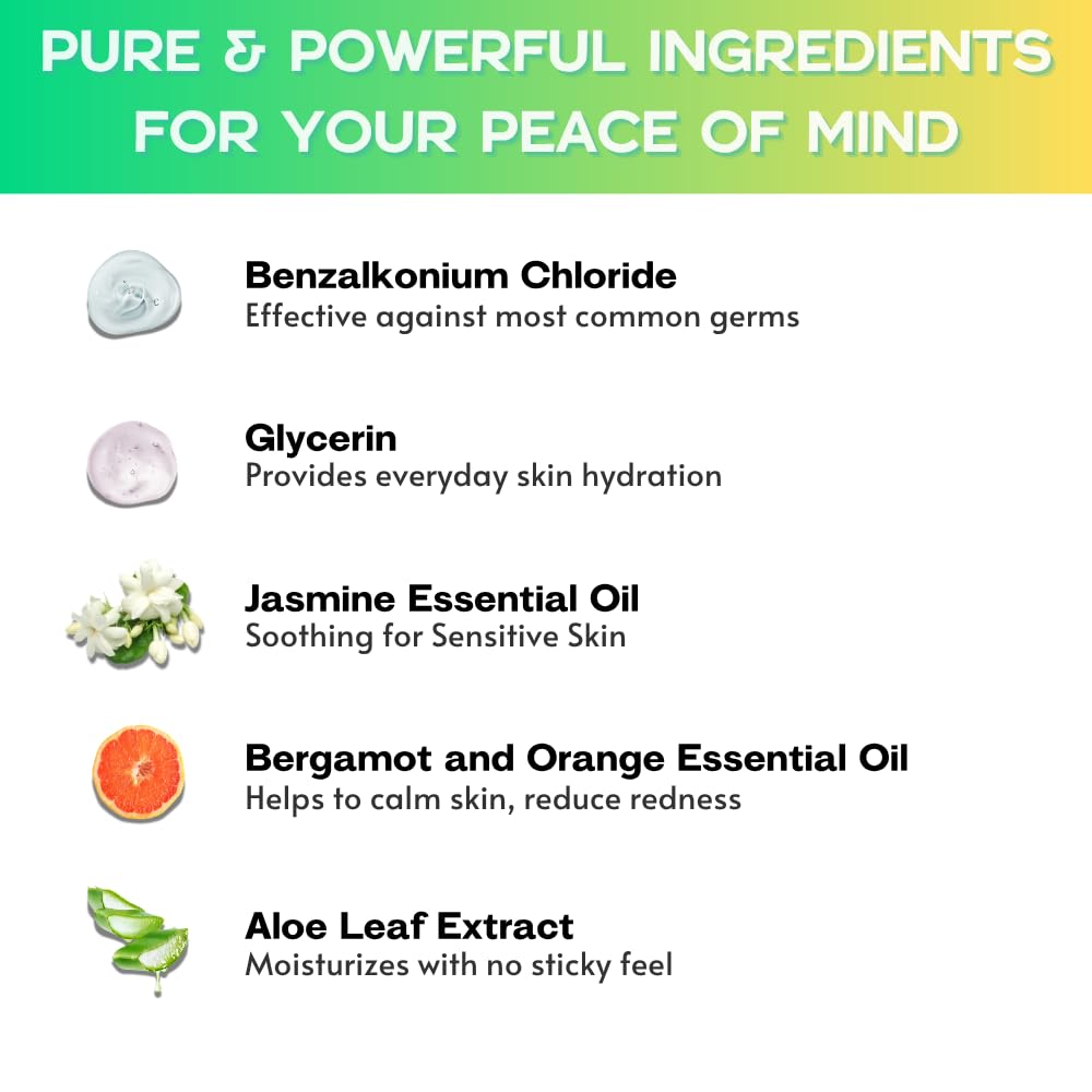 - MOISTURIZING & REFRESHING β Infused with Aloe Vera, Glycerin, and Jasmine Essential Oil to hydrate and refresh hands, leaving skin soft, smooth, and non-sticky.