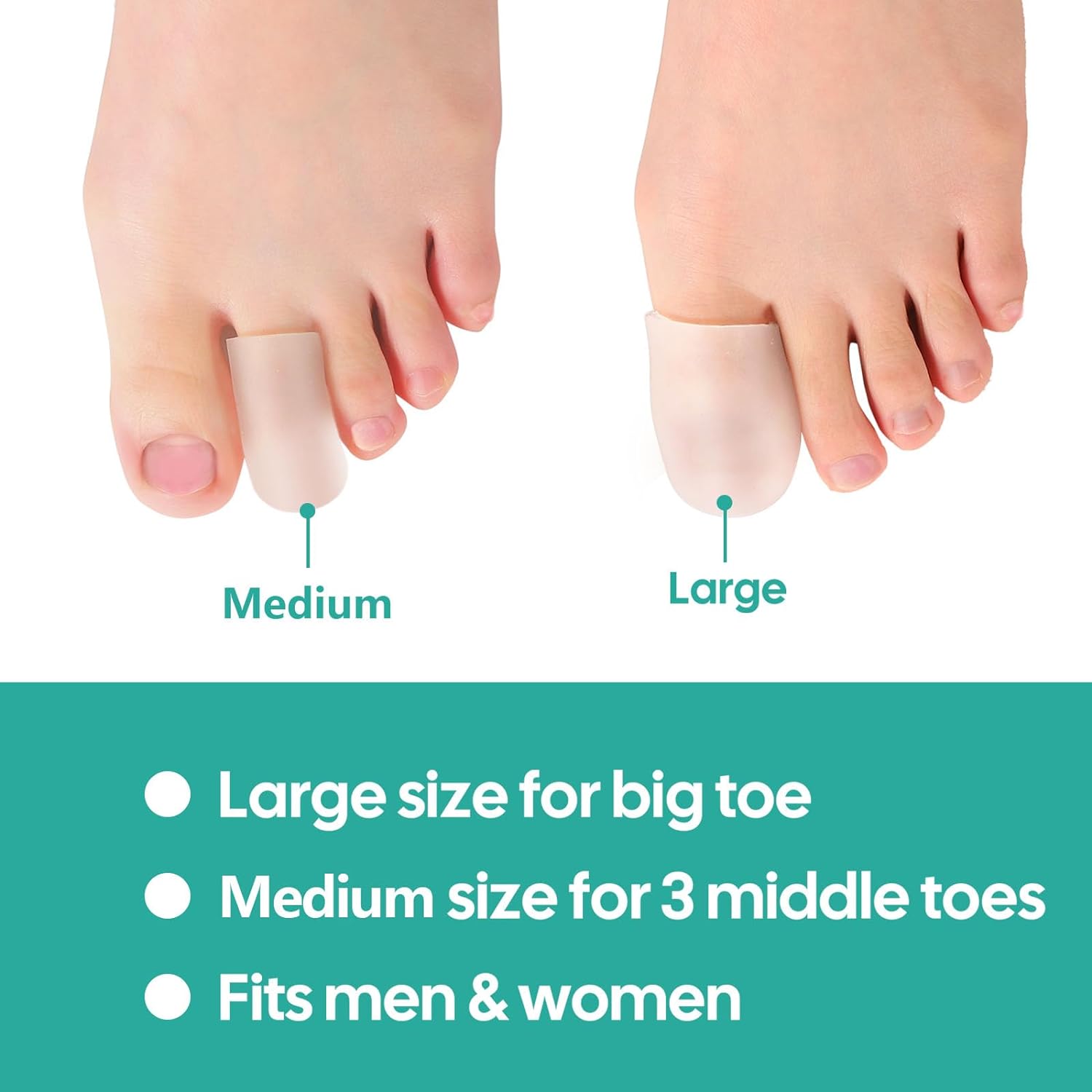 - Convenient Sizes: The gel toe protector set includes 2 pairs (large size) that can be easily trimmed to fit perfectly on your big toe and 4 pairs (medium size) that can be easily trimmed to fit perfectly on your 3 middle toes. These silicone toe sleeves are washable and reusable. Try them out and experience the relief for yourself!