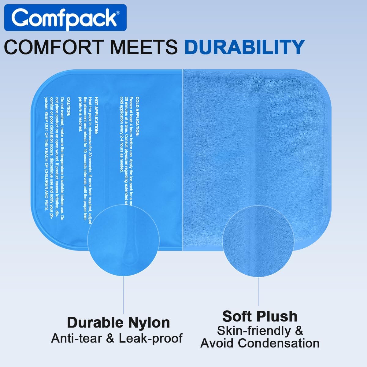 - Reversible Design with Plush Lining - Comfpack body ice pack is designed with soft plush lining which is comfortable against skin, help to avoid water condensation and frostbite, also transmits soothing coldness without extra towel wrapping. While the other side is made of waterproof durable nylon which is leak-proof and can transfer penetrating coldness, easy to clean.