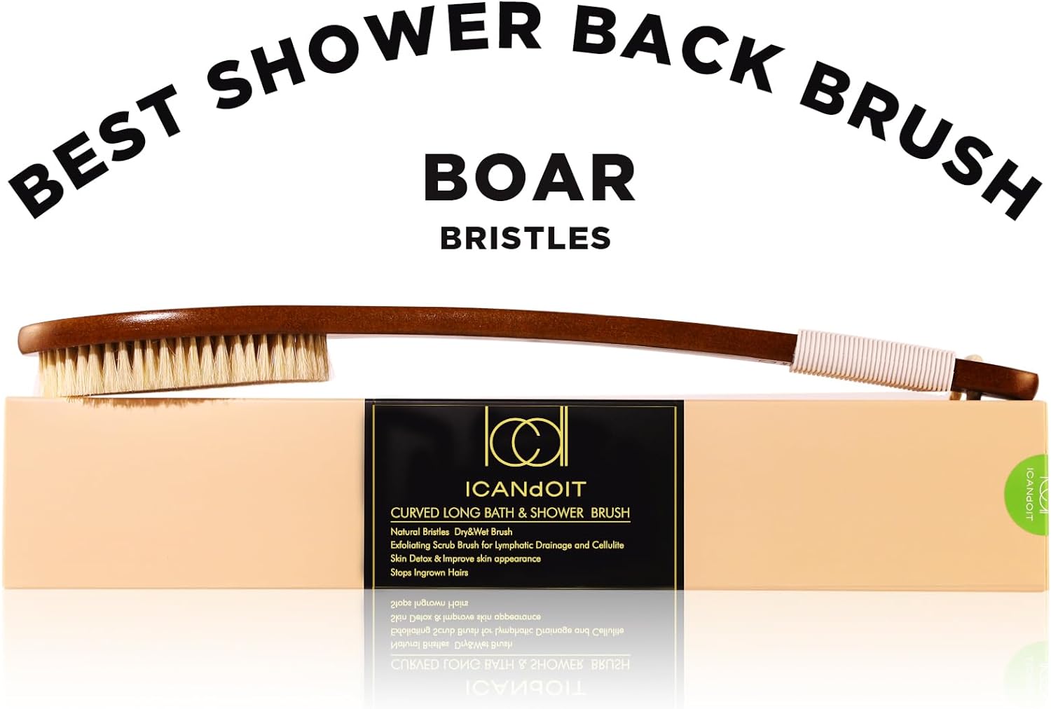 ICANdOIT-17.71Inch Natural Boar Bristles Anti-Slip Curved Long Handle Bath Brush,Bent Handle Shower Scrubber for Exfoliating,Shower Back Brush