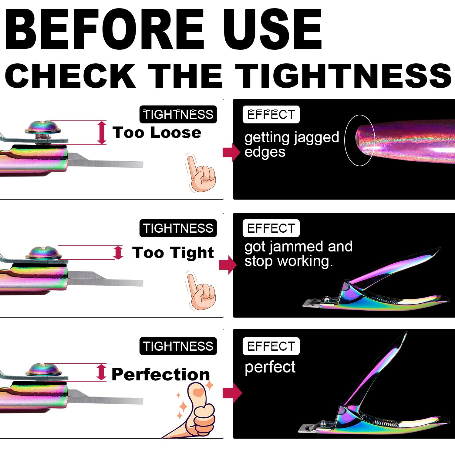 - Sharp Blade and Smooth Nails -- Cut acrylic nails quickly and smoothly with this sharp-blade and strong-springe clipper. The comfortable handle and safe edge design make cutting nail tips a breeze. Please check the tightness of the screw before use, perfect tightness will make sure you clipper work well