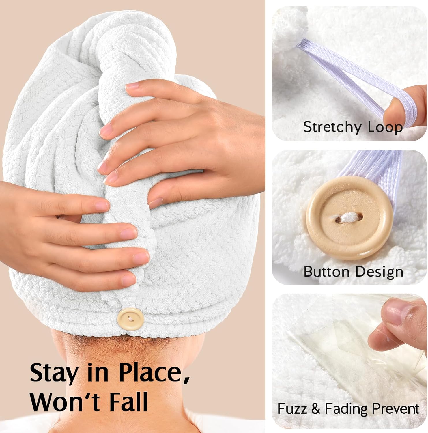 YFONG 2 Pack Large Microfiber Hair Towel Wrap for Women, Thicken Super Absorbent Quick Dry Hair Turban for Drying Curly Long Thick Hair Anti Frizz, Hair Drying Towel with Button for Wet Hair