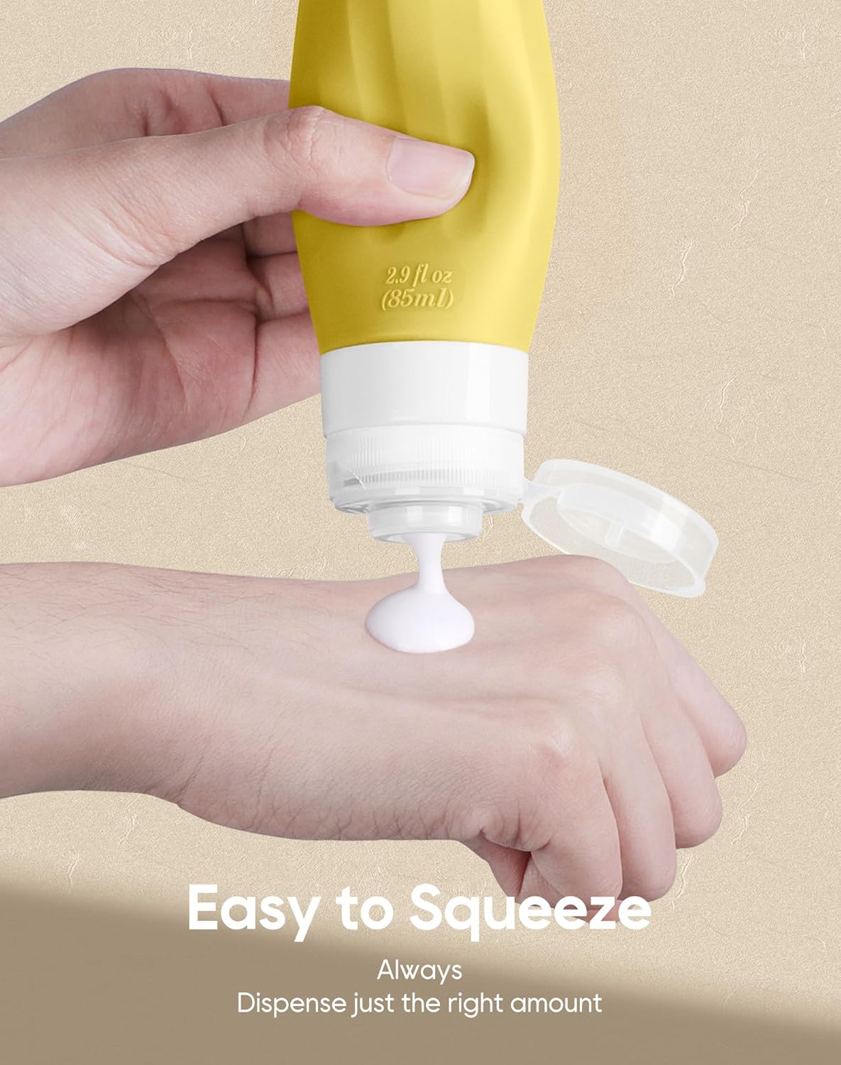 - SAFE SILICONE MATERIAL: Made of Food Grade BPA Free Silicone, this travel set is sturdy, soft, squeezable, flexible and reusable. Safe material guarantee that you can not only use them to store shampoo, conditioner, face soap, sunscreen, creams, lotion or etc, but also safe for food, various seasonings. Soft silicone body make you squeeze out contents easily