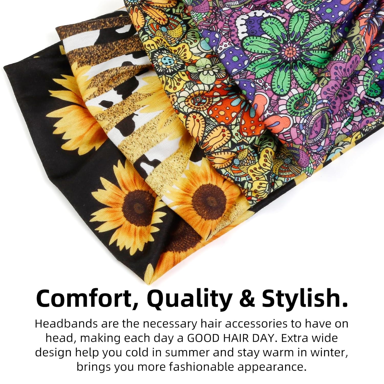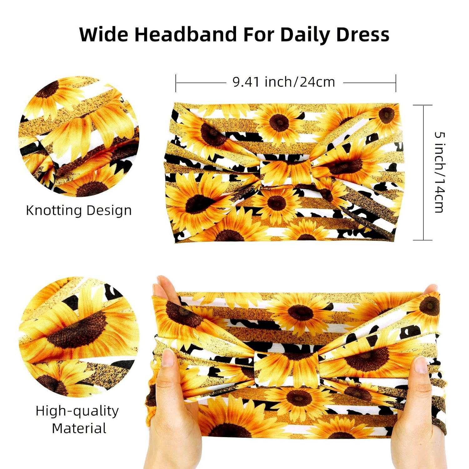 Huachi 4 Packs Boho Headbands for Women Wide Sunflower Thick Head Bands for Women's Hair Flower Printed Elastic Hairbands Large African Sport Yoga Turban Headband Hair Accessories (Pack of 4)