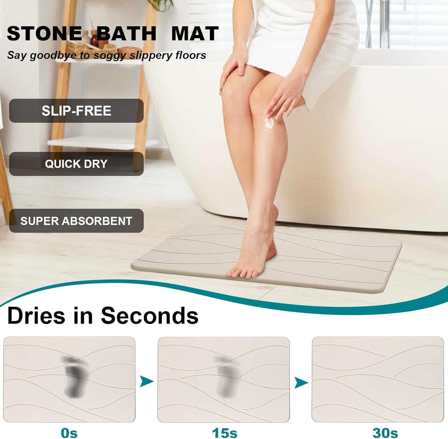 - Fast Drying & Super Absorbent: Bath stone mat is made of organic diatomaceous earth, provided with instant dry performance and super absorbency, can evaporate water from the surface in 30 seconds, keep your bathroom dry and hygienic