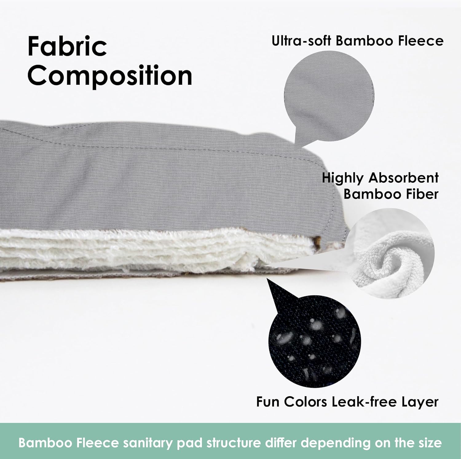 - Breathable Layer: Cloth panty liners structure differ depending on the size. Menstrual cloth pads Inner layer is ultra-soft fleece which lays against your skin, moistures wicking, and neutralizes odor. Lining layer is super-absorbent, and different sizes the layers are different. Outshell layer is leak-free TPU with backside silicon dot. The soft and gentle reusable sanitary pads offer great coverage and absorbency to keep you from leaks and spills