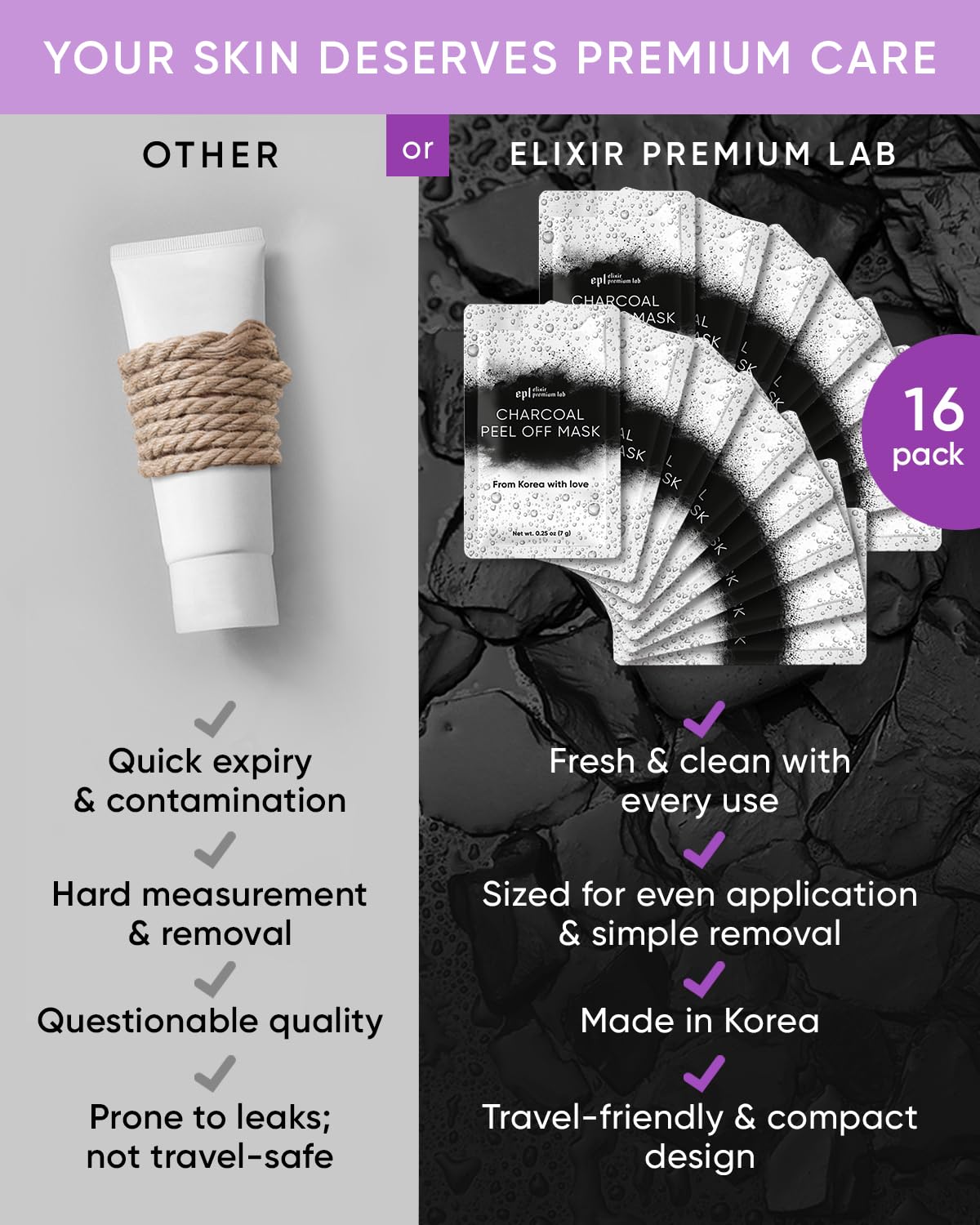 - Hygienic & Compact Design: Our charcoal face mask is packed in single-use peel off face mask skin care sachets; Simply apply, let dry, peel off & you’re ready to go; Travel freely & keep your skin clean with our face masks skincare peel off