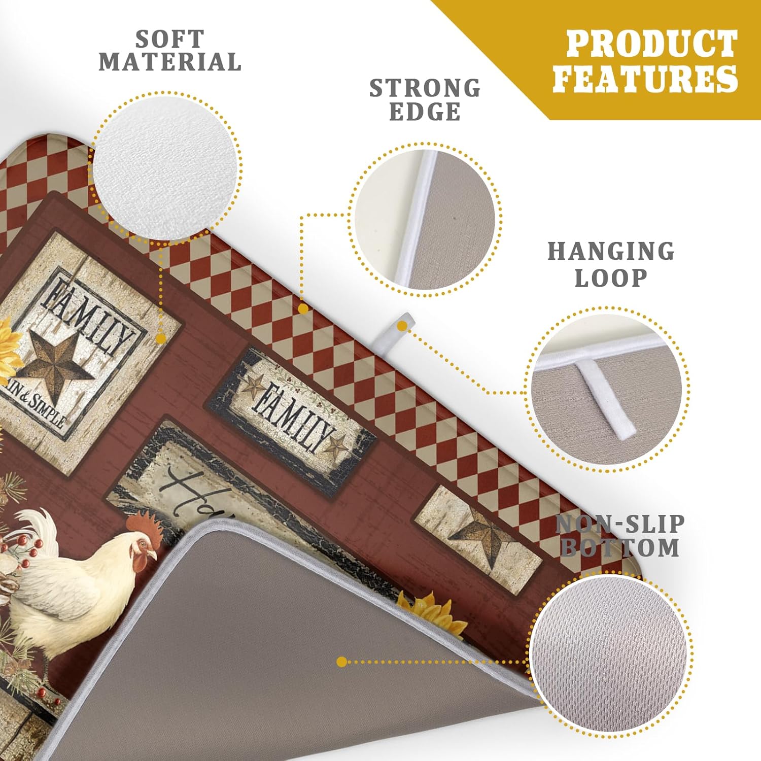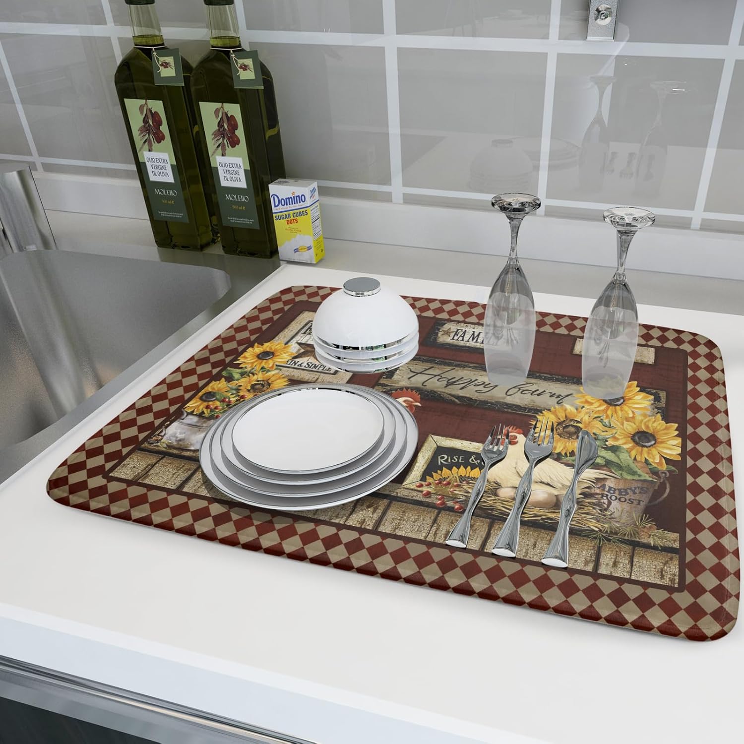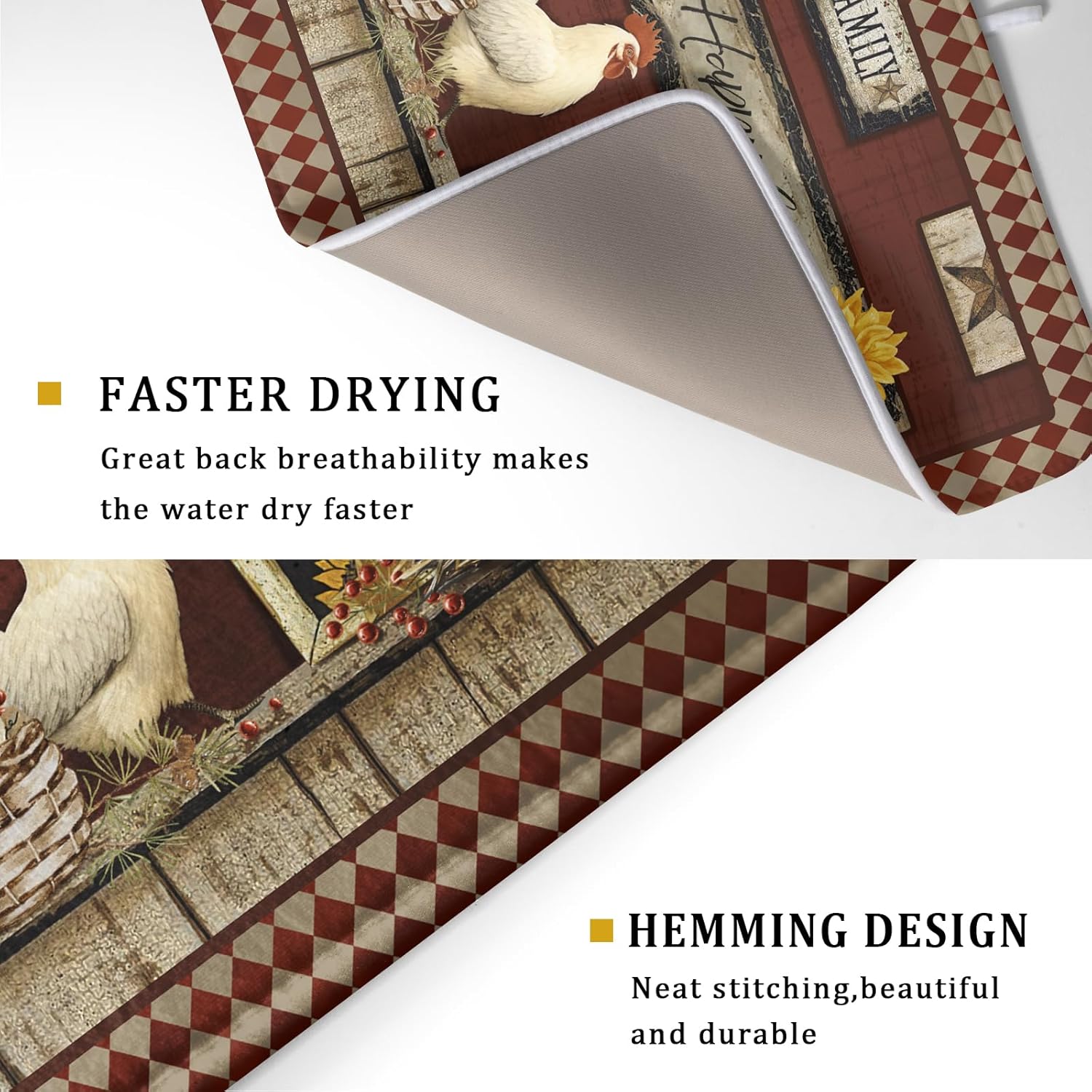 Vintage Rooster Dish Drying Mat 18x24 Inch Farmhouse Chicken Dish Drainer Pad Microfiber Absorbent Fast Dry Kitchen Counter Accessories