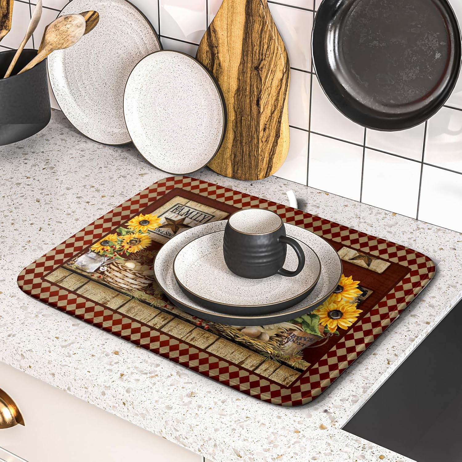 - 【Wide Usage】The dish drying mat designed with sunflower flowers pattern, it is beautiful, soft, and durable. Not only a dish drying mat, cup mat, heat resistant mat, you can also use it as a kitchen countertop insulation mat. It is also a good choice to use it as a pet mat, picnic mat.