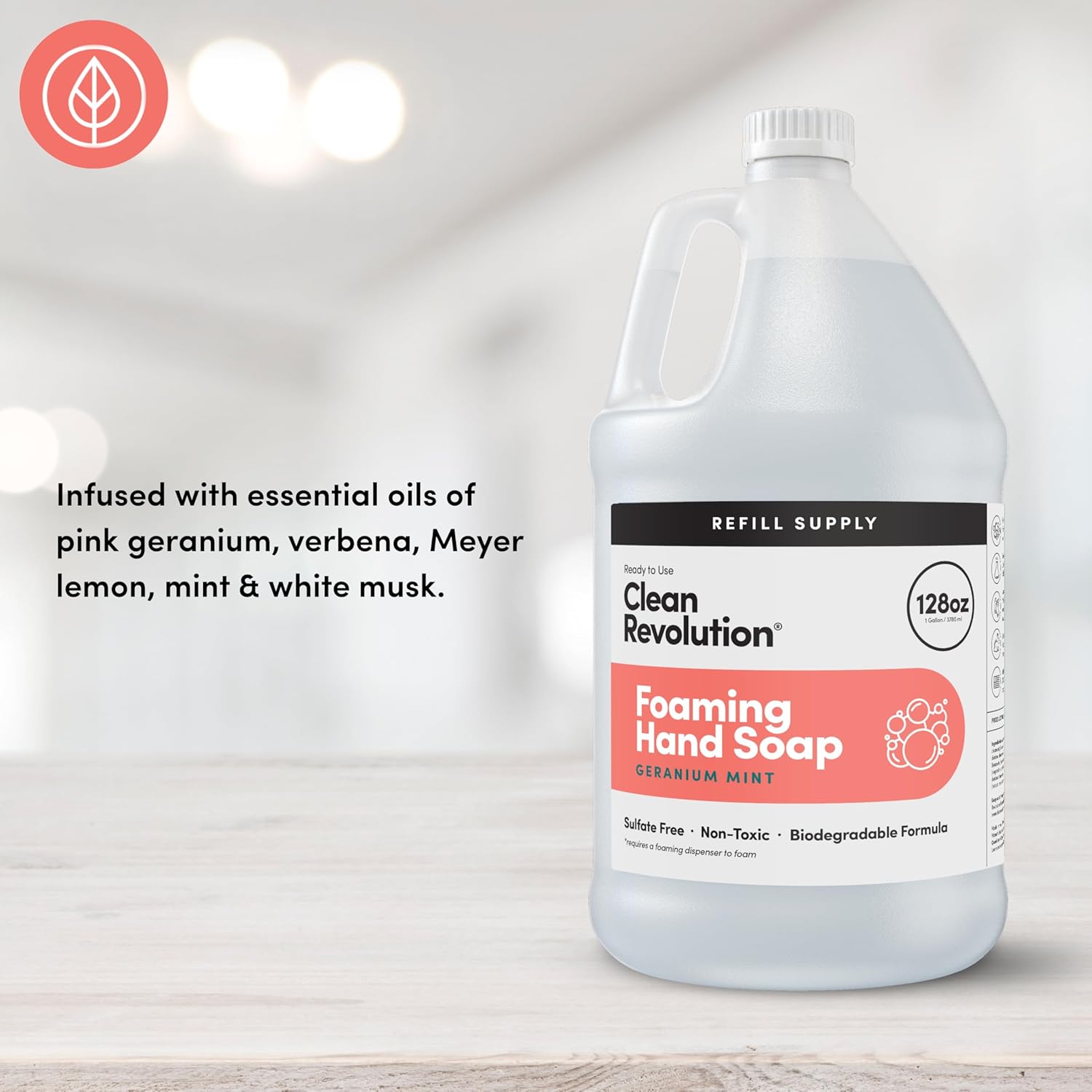 Clean Revolution Foaming Hand Soap, Gentle, Moisturizing, Ready To Use Formula, Real Essential Oils, Gluten Free, Geranium Mint, 128 Fl Oz