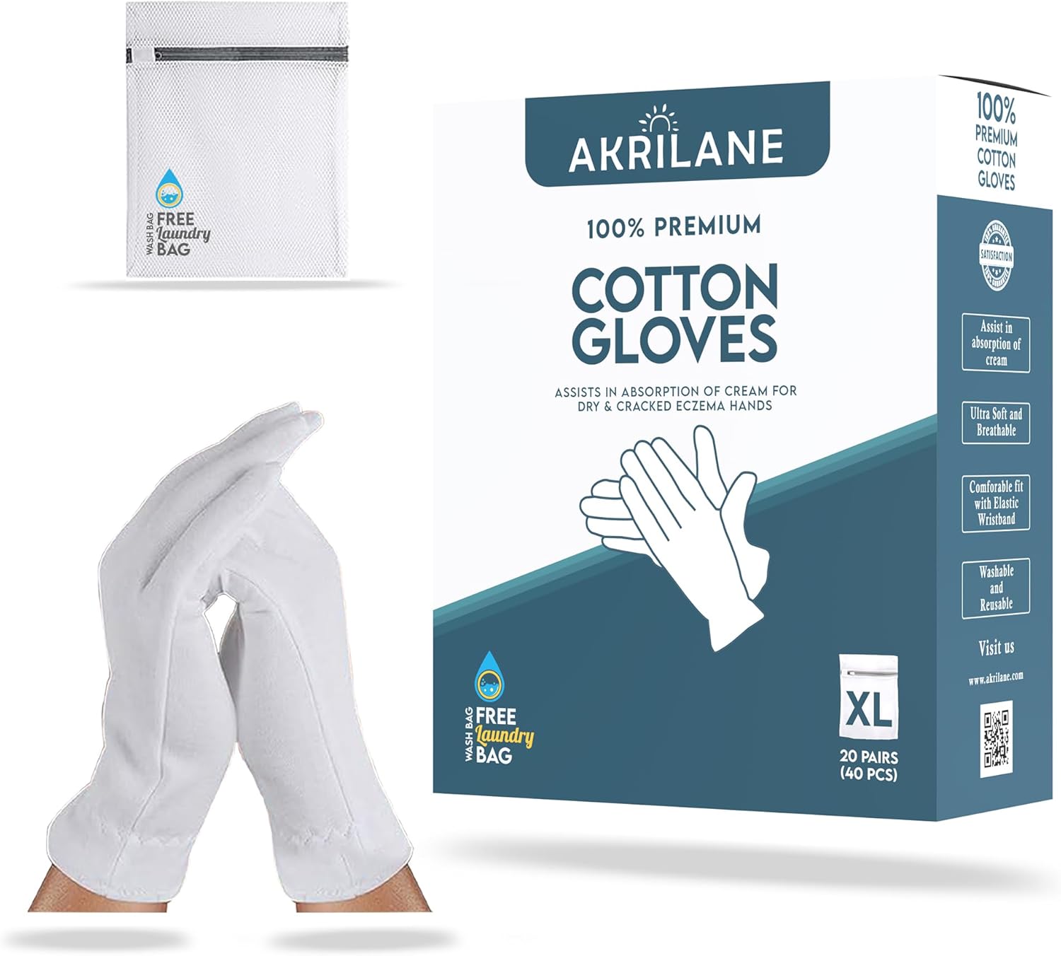 AKRILANE XL Extra Large 20 Pairs Cotton Moisturizing Gloves for Dry Hands | Eczema, Psoriasis & Skin Spa Treatment for Women & Men | Washable & Reusable with Free Laundry Bag