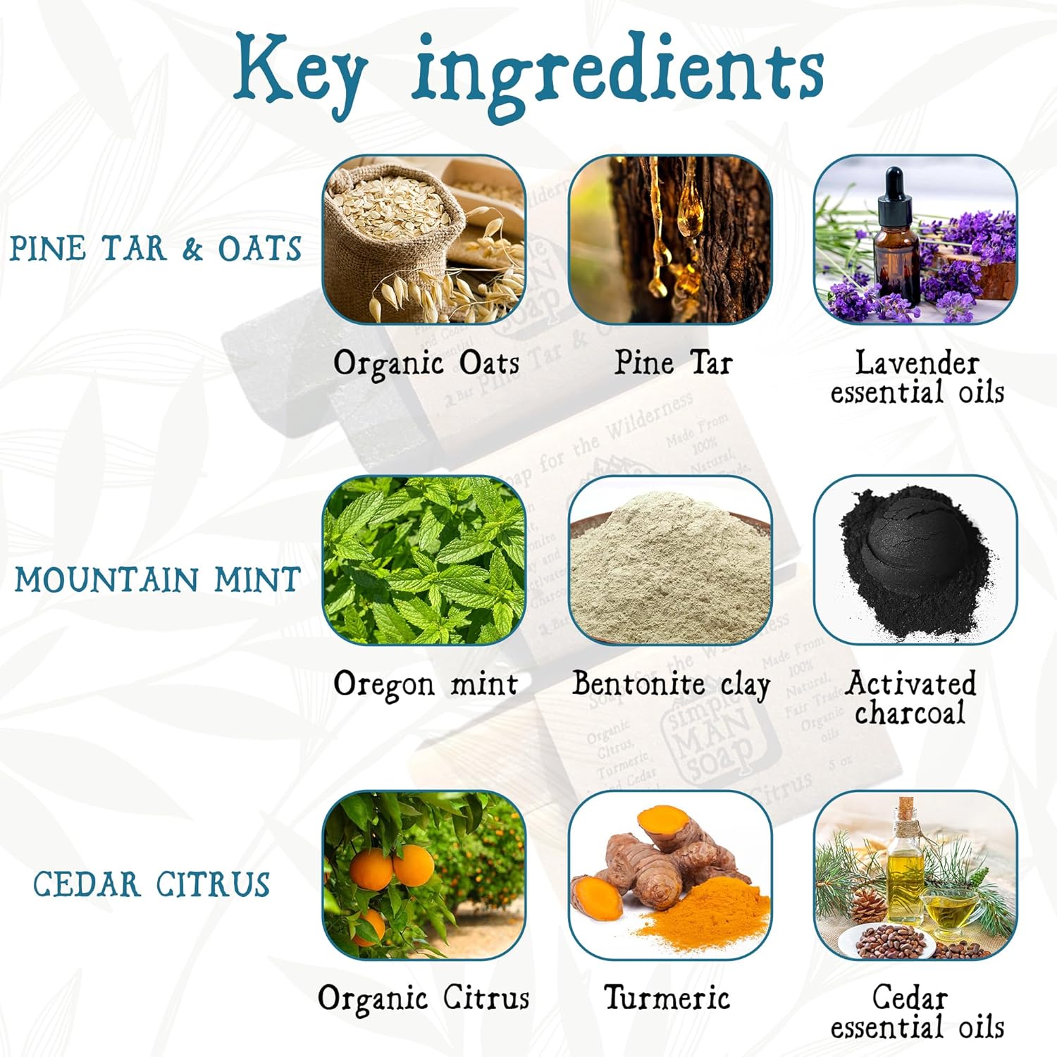 SimpleMan Soap Bar (Pine Tar/Cedar Citrus/Mint) - Men’s soap with Organic & Fair Trade Essential Oils - All Natural Man Bath Soap Bars-Pack of 12-2.5 Ounce bars(30 Ounces Total)