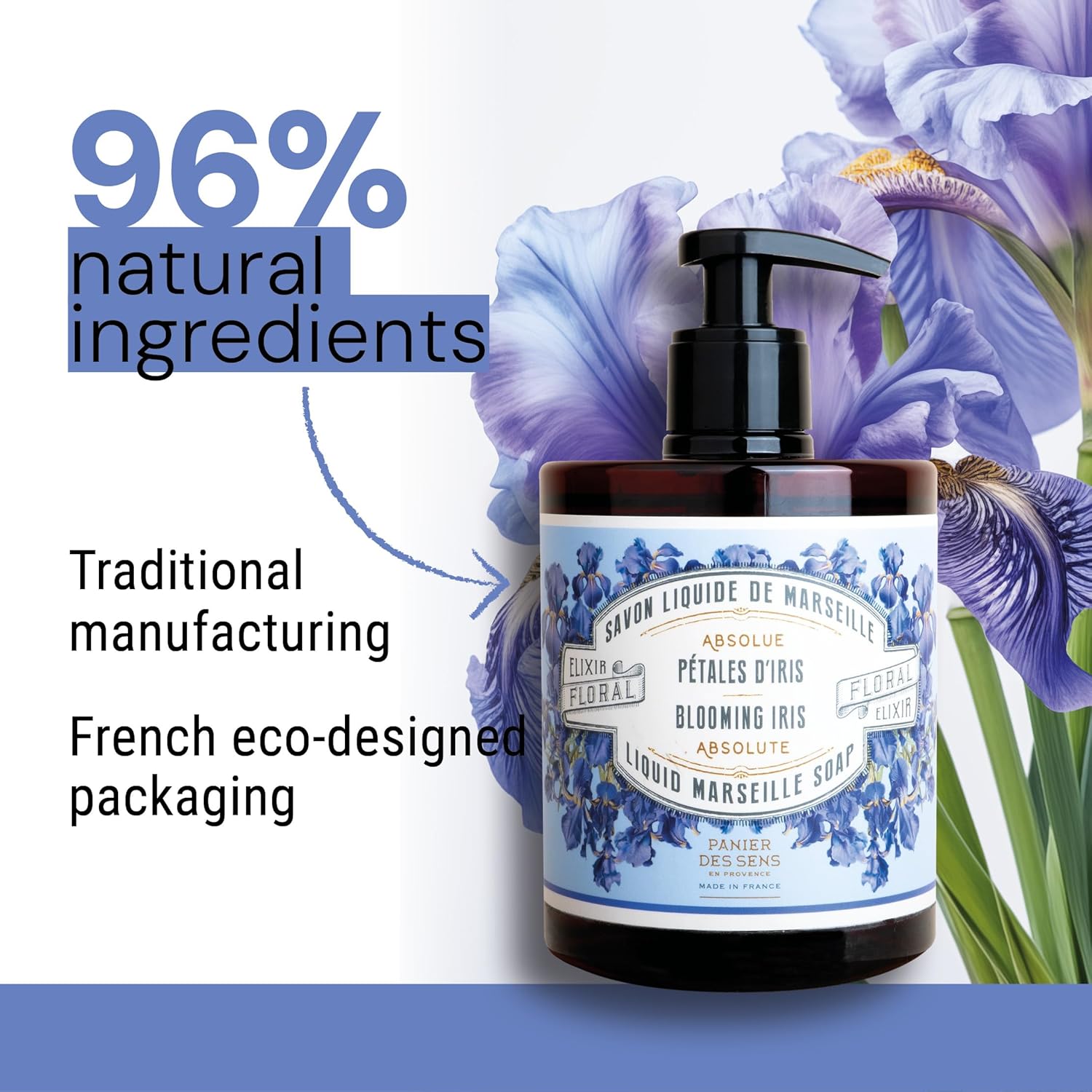 Panier des Sens - Moisturizing Hand Soap - Iris Floral Fragrance - French Traditional Savon de Marseille Soap - Refillable Kitchen & Bathroom Soap - 16.9 Fl.oz Liquid Hand Wash 96% Natural