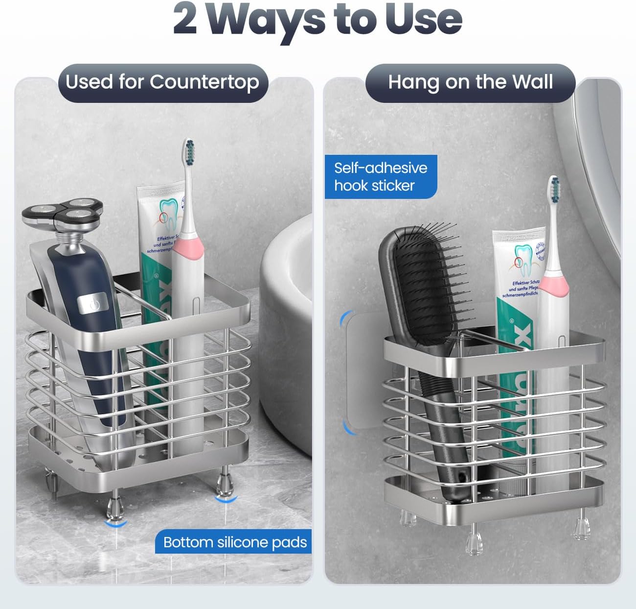 - Wall Mounted and Countertop Use: Our toothbrush holder is perfect for both wall-mounted and countertop use. With an adhesive hook, it effortlessly adheres to any smooth wall surface (suitable for tile, marble, glass, or metal), requiring no drilling and leaving no damage to your walls. And when you prefer countertop use, the silicone pads on the base of toothbrush holder ensure stability and prevent scratching the countertop.