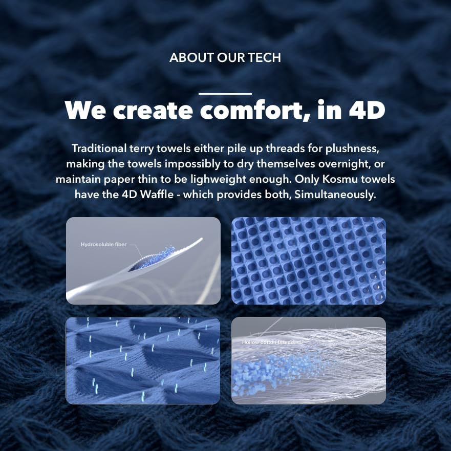 - Get bone dry every A.M.: While the waffle structure intrinsically maximizes surface exposure for airflow for guaranteed breathability, allowing the towel to dry itself out quickly, we have fundamentally improved the performance of Kosmu Towel with advanced science and technology.