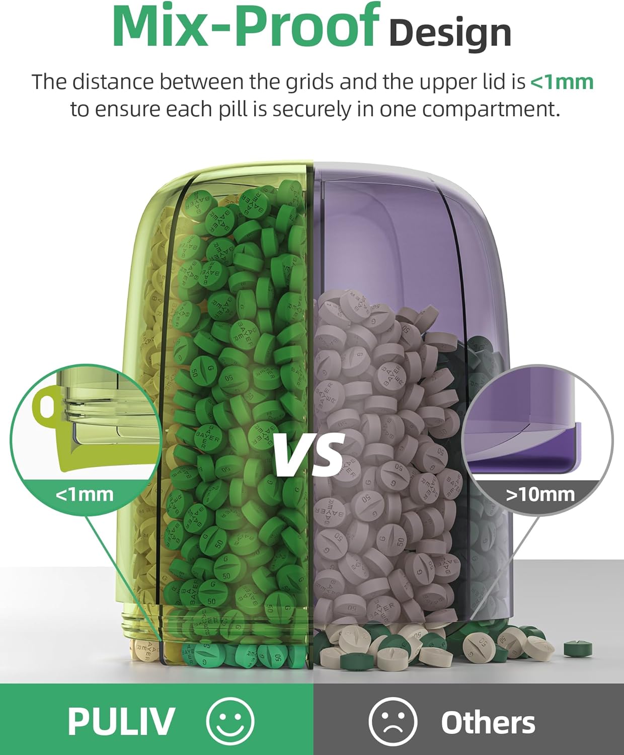 - Say Goodbye to Mixing Pills: PULIV jumbo medication organizer with the design that the distance between the grids and the upper lid is close to ensure anti-mixing pills. Stop being troubled by pills mixing when pouring. Please note: This organizer is not suitable for storing gummy vitamins. For optimal use, store in a dry place and avoid direct sunlight exposure