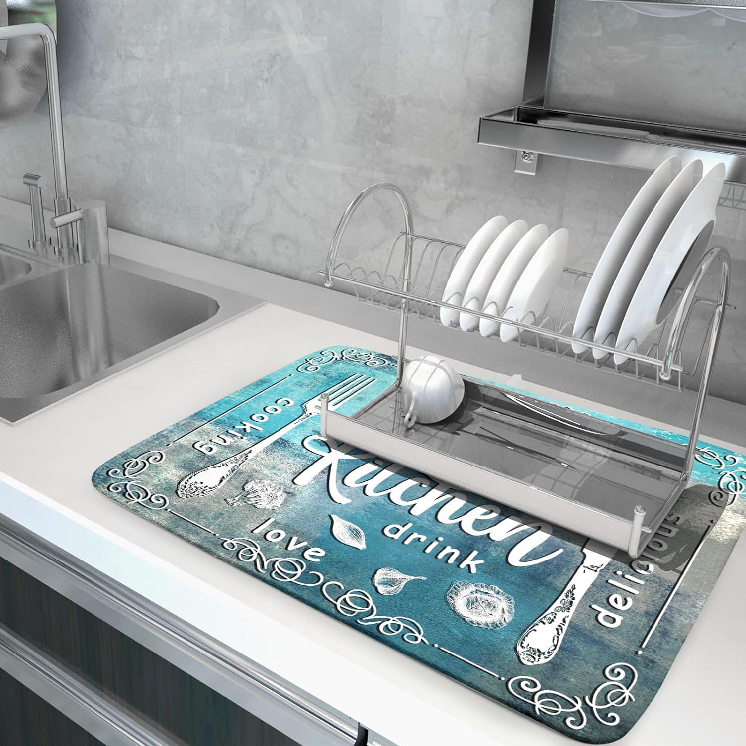 Blue Grey Dish Drying Mat 18x24 Inch Cooking Delicious Absorbent Drying Pad Heat Resistant Dish Drainer Mats for Kitchen Countertop