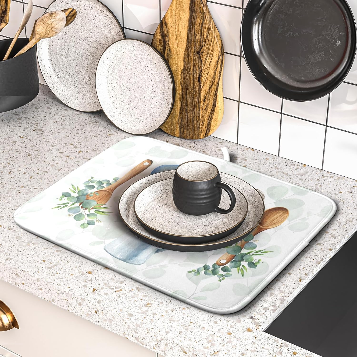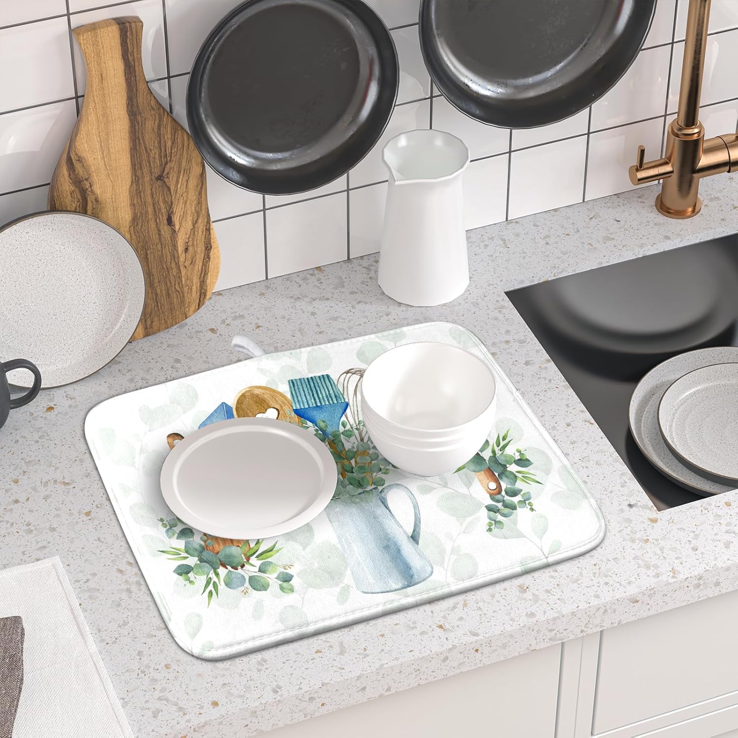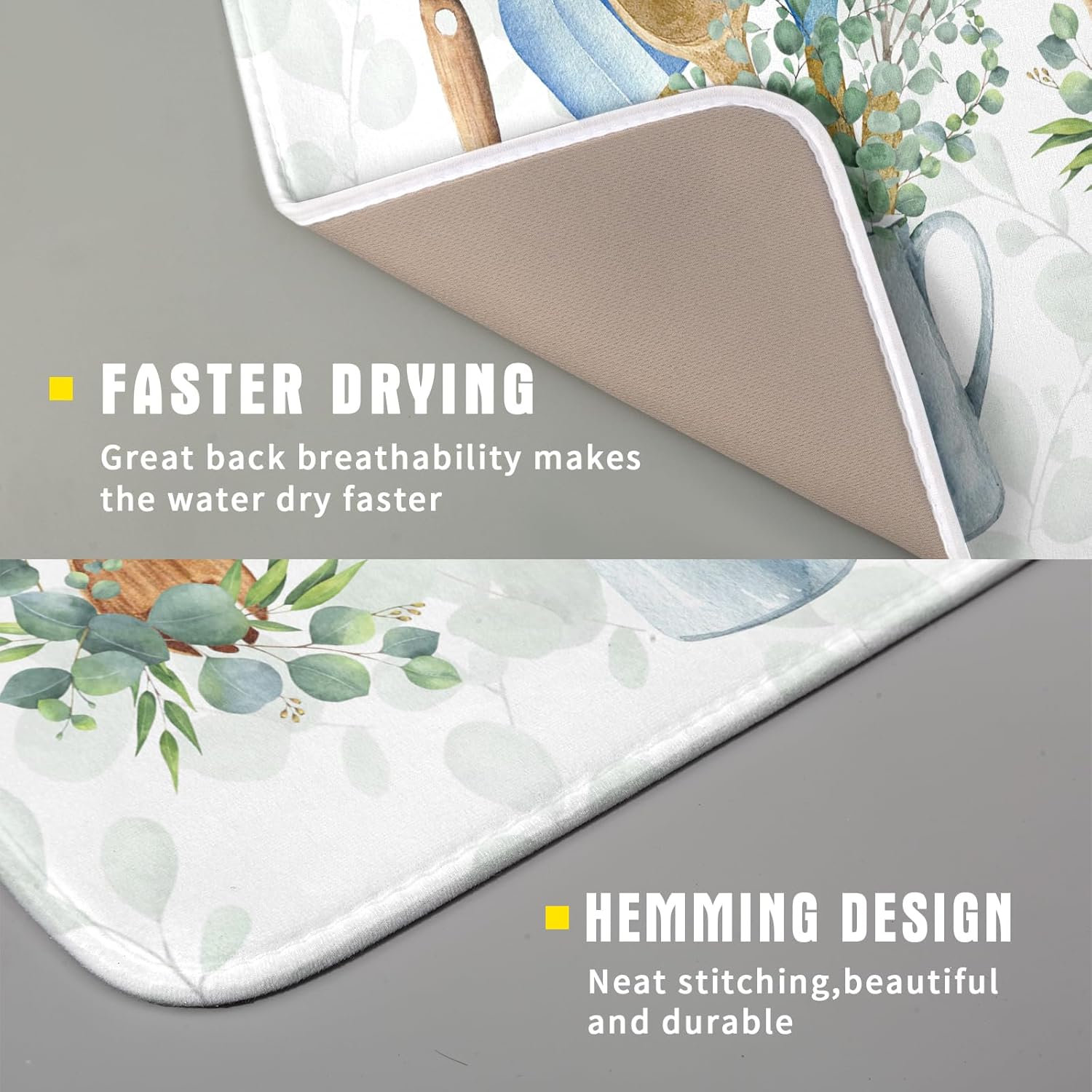 - 【Wide Usage】The dish drying mat designed with kitchen tool pattern, it is beautiful, soft, and durable. Not only a dish drying mat, cup mat, heat resistant mat, you can also use it as a kitchen countertop insulation mat. It is also a good choice to use it as a pet mat, picnic mat.