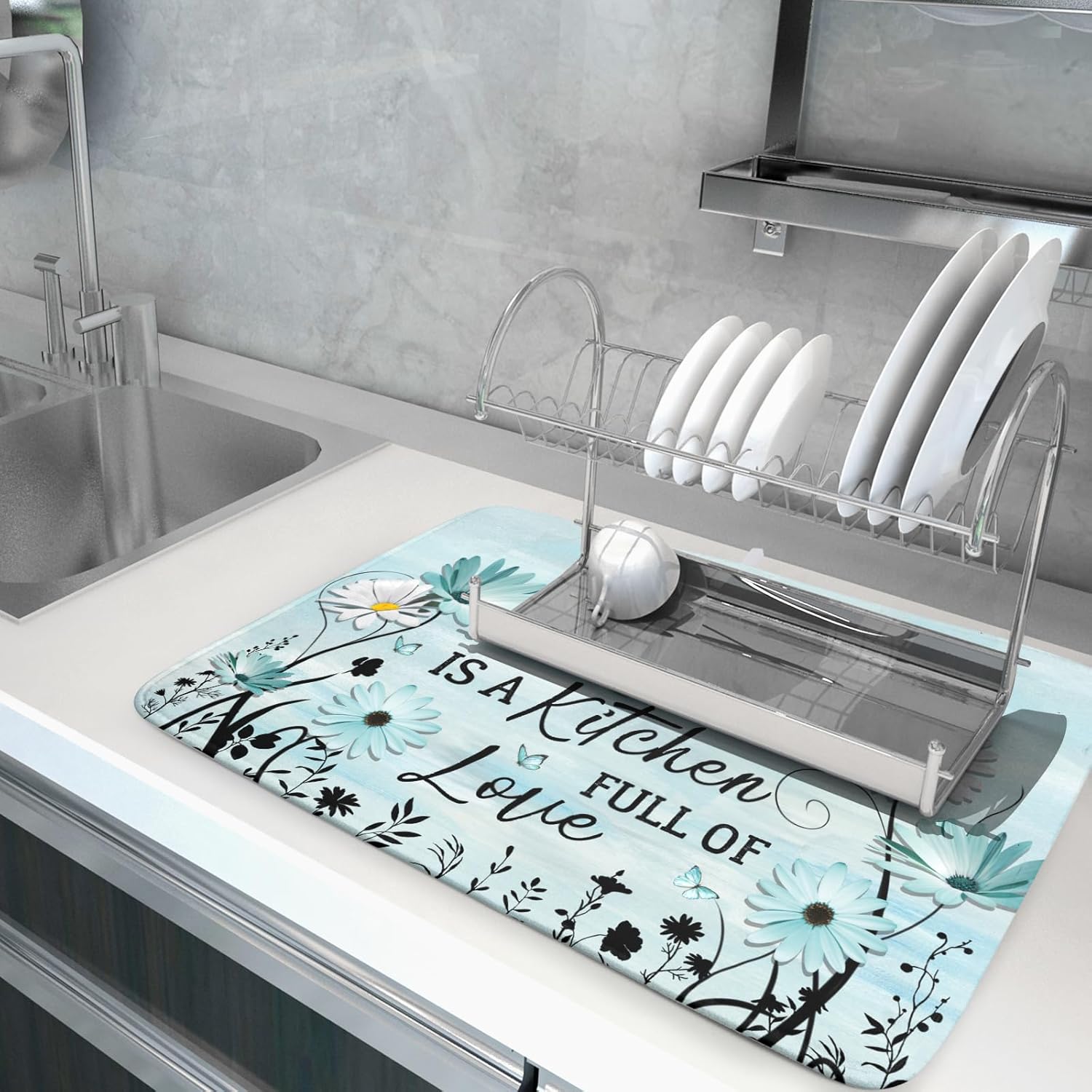 Blue Daisy Dish Drying Mat 18x24 Inch Love Kitchen Absorbent Microfiber Washable Fast Drying Pad Dishes Rack Mat for Kitchen Counter