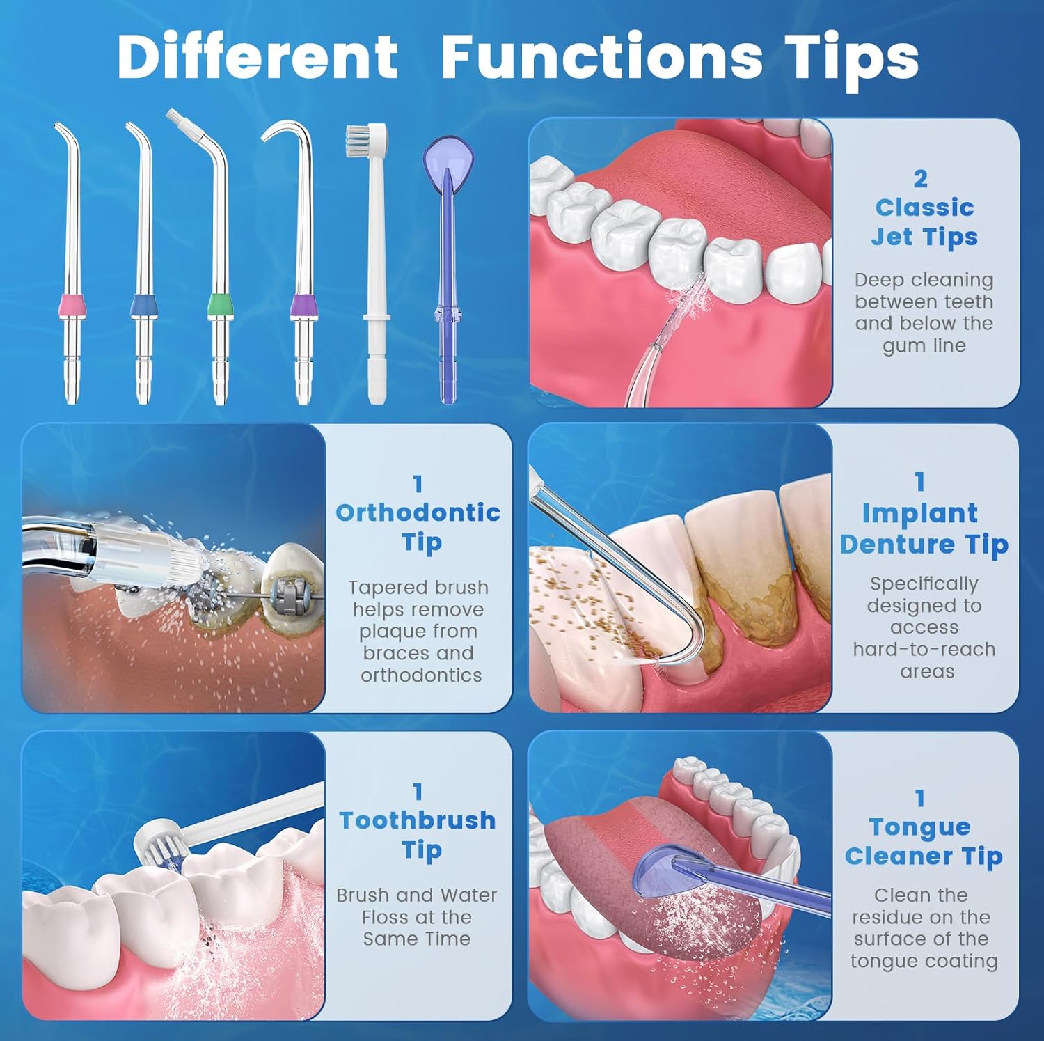 - Premium Replacement Parts for Water Pick: Include various color coded tips to meet your different cleaning needs. (2 Classic Jet Tips+1 Orthodontic Tip+1 Implant Denture Tip+1 Toothbrush Tip+1 Tongue Cleaner Tip)