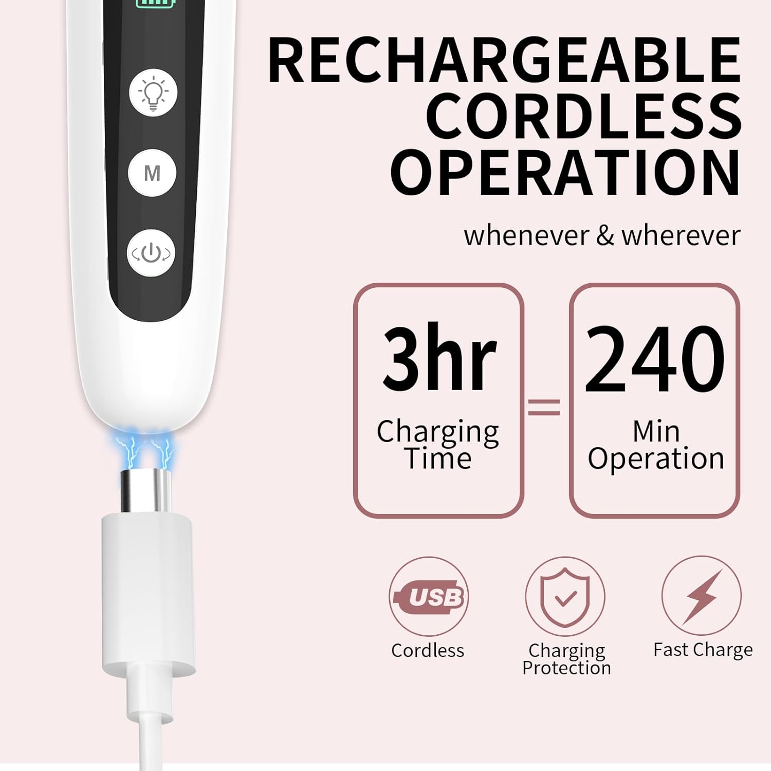 - Cordless, Rechargeable, LCD Display: Type C USB Cable included, this electric manicure pedicure kit can be up to 4 hours of Runtime on a single charge, LCD Display help remind you the rest power it left and the Speed level you used. Professional electric nail file for home salon use, or travel , you can do a spa hand and foot care experience at anytime anywhere you want.