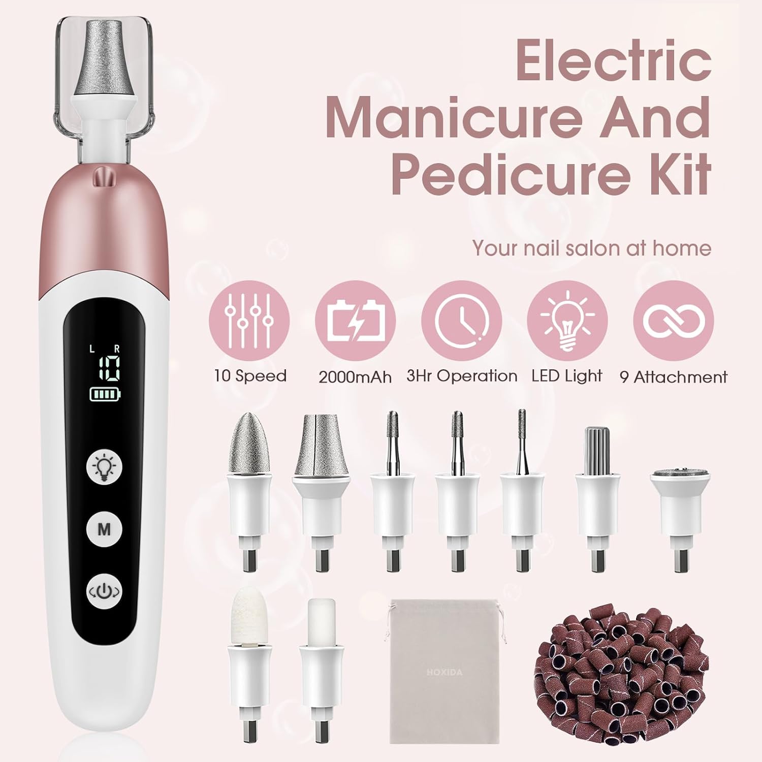 - Professional Manicure and Pedicure Set: If you have no time go to salon and want enjoy a salon-quality professional manicure pedicure at home, You search is over !!! Hoxida electric nail file provide a whole hand and foot care, all-around shaping, buffing, grinding, polishing, cuticle, hard skin, callus removing,perfect manicure kit for women trimming, grinding and polishing natural nails and toe nail grinder kit for thick nails.