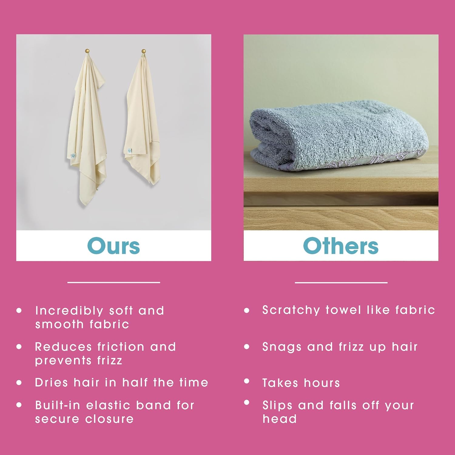 - Ultra-Absorbent Fabric – Our 100% combed cotton hair plopping towel naturally drinks up moisture like nothing else, cutting your drying time in half while being gentler on delicate hair strands than traditional terry cloth bath towels.